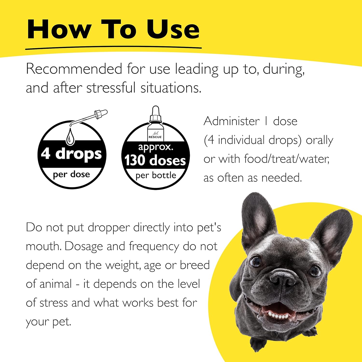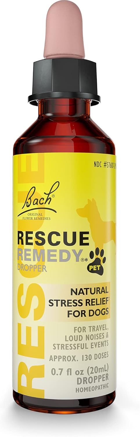 Bach RESCUE REMEDY PET Dropper for Dogs 20mL: Natural Stress Relief & Calming Aid. The original Rescue Remedy Pet formula in new, custom designed packaging just for dog parents! Helps reduce stress-related dog behavior and tension caused by separation, change in routine or environment, visits to the groomer or vet, thunder, fireworks, kennel stays & more. Claims based on traditional homeopathic practice, not accepted medical evidence. Not FDA evaluated. Individual results may vary,SEDATIVE-FREE STRESS RELIEF: For tension caused by separation, change in routine or environment, visits to the groomer or vet, thunder, fireworks, kennel stays & more,WELLBEING SUPPORT: Helps calm and reduce stress-related dog and puppy behavior like excessive barking, shaking, licking, panting, and cowering,TRUSTED BY DOG LOVERS WORLDWIDE: Made with the original RESCUE REMEDY tincture - Dr. Bach's blend of 5 natural flower essences, hand-picked from his original gardens in the UK,PET-SAFE FORMULA: Doctor-developed, plant-based, homeopathic active ingredients, vegan, vegetarian. FREE OF: Artificial flavors/colors, gluten. Non-alcohol,FOR ALL AGES, BREEDS & WEIGHTS: Give 4 drops orally or with food/water. Can be used with other dog health & wellness products like stress medications, supplements, and calming shirts, vests, or collars,SATISFACTION GUARANTEED: Covered by the Nelsons 45-Day Satisfaction Guarantee. Additional terms apply. See below for details