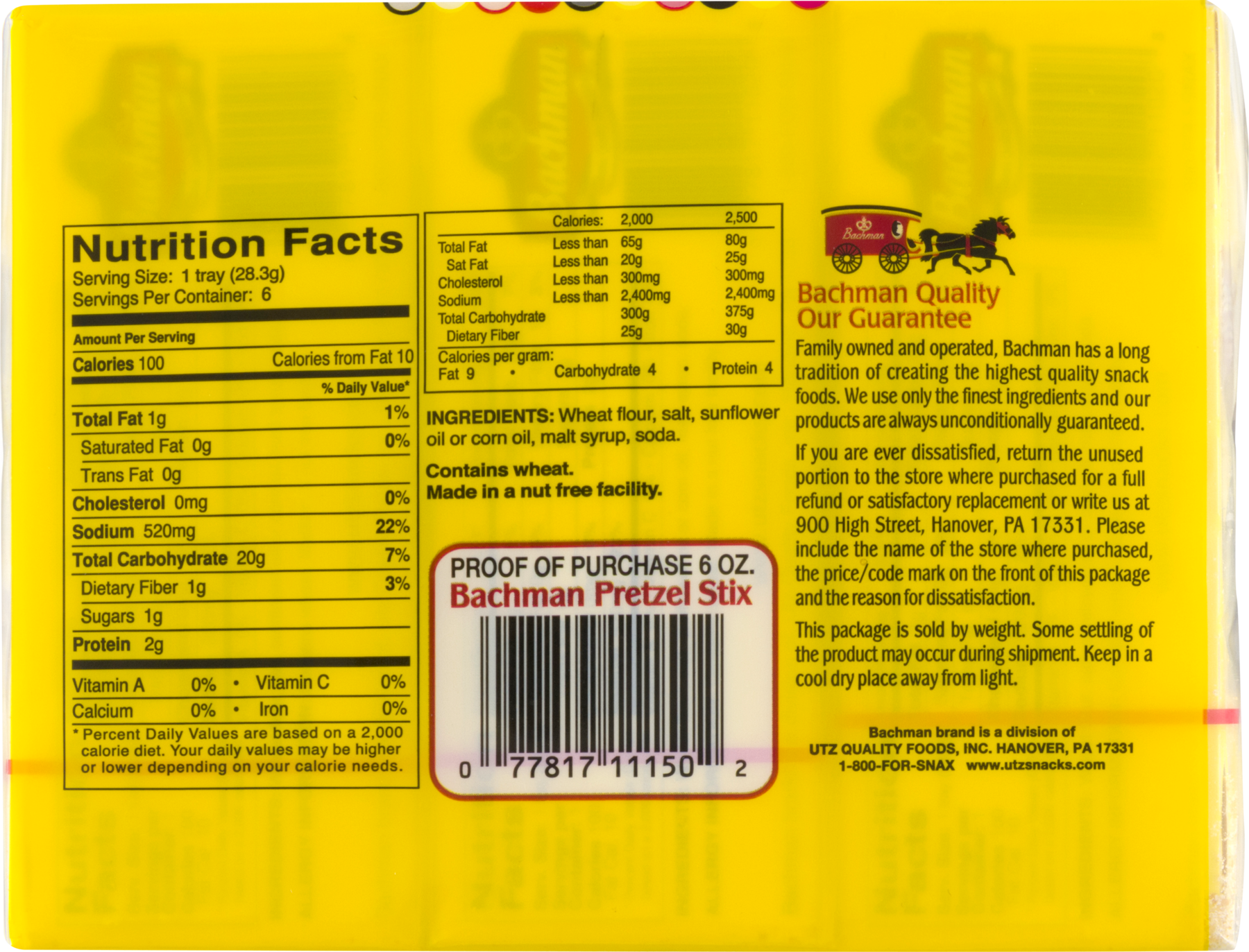 You will receive 6 packages of Bachman Pretzel Stix®, each package has 6- 1oz. trays. There are no artificial colors, flavors, or preservatives. Made with only finest ingredients. Family owned and operated, Bachman has a long tradition of creating the highest quality snack foods. We use only the finest ingredients and our products are always unconditionally guaranteed. Bachman Pretzel Stix® 6-1 oz. Trays (6 Packages)