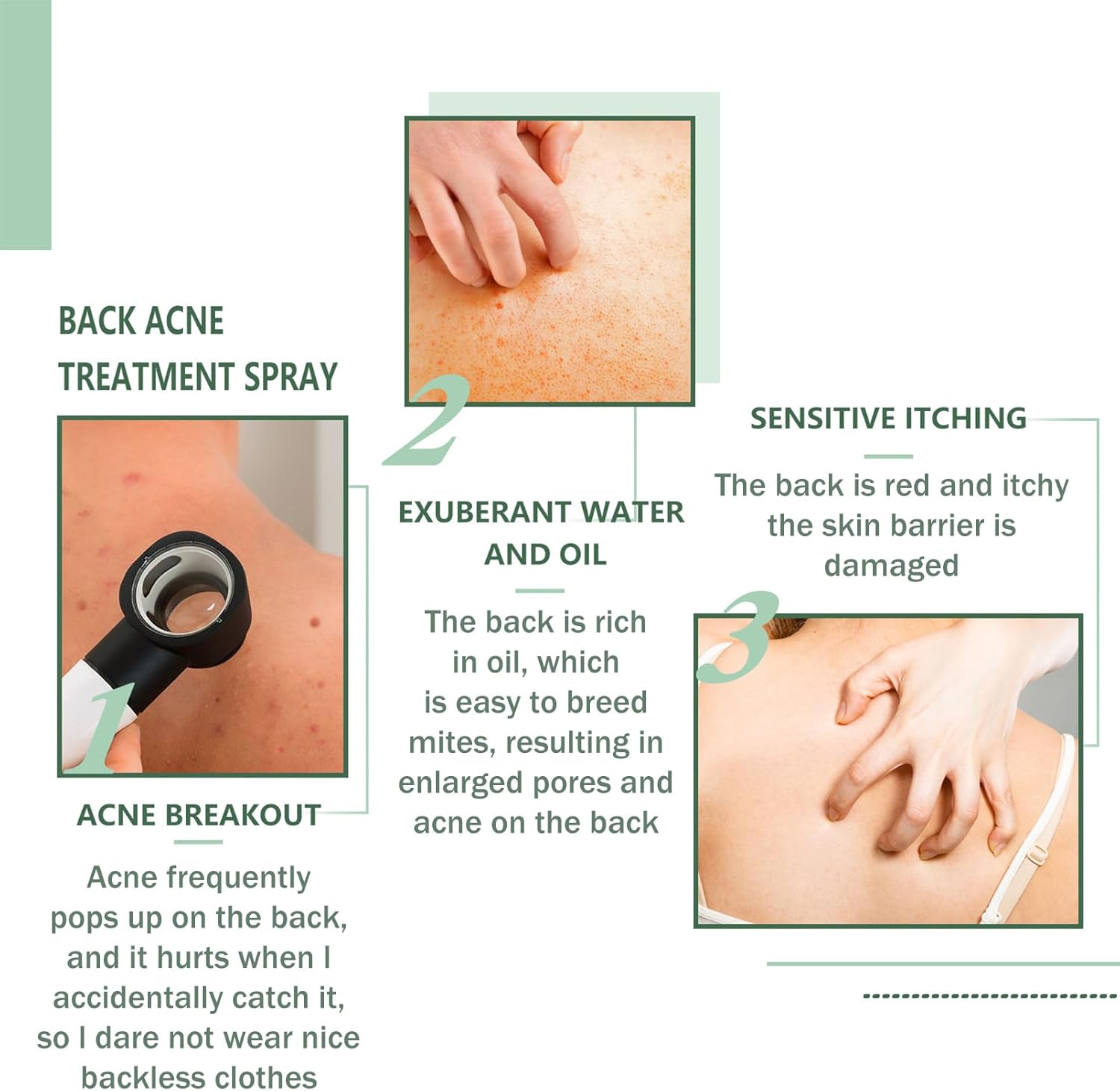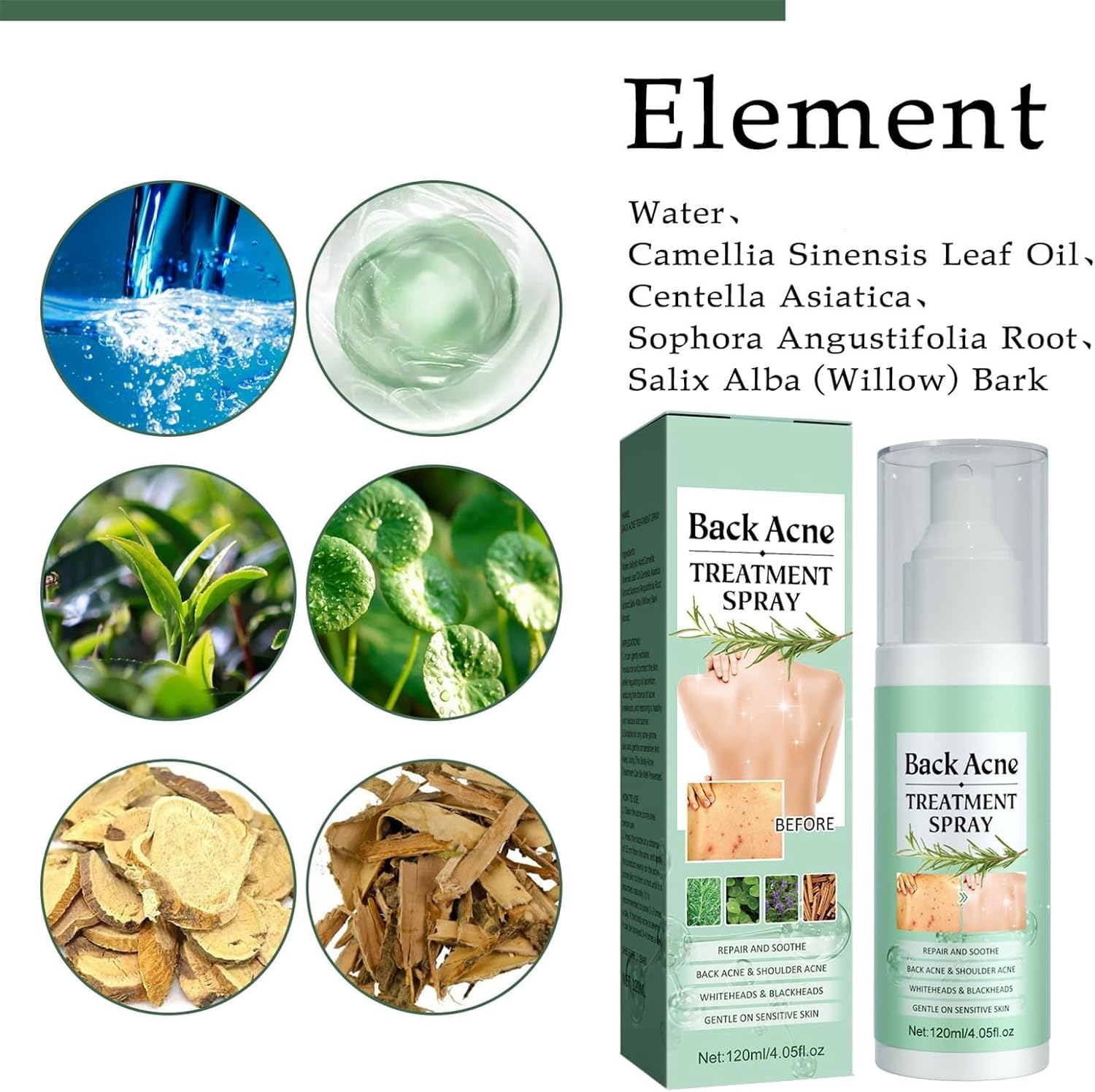 About The Product : ?Back Acne Treatment Spray?It specifically targets stubborn acne on the body, reduces the accumulation of sebum that forms acne, effectively clears skin acne, and keeps skin smooth and delicate