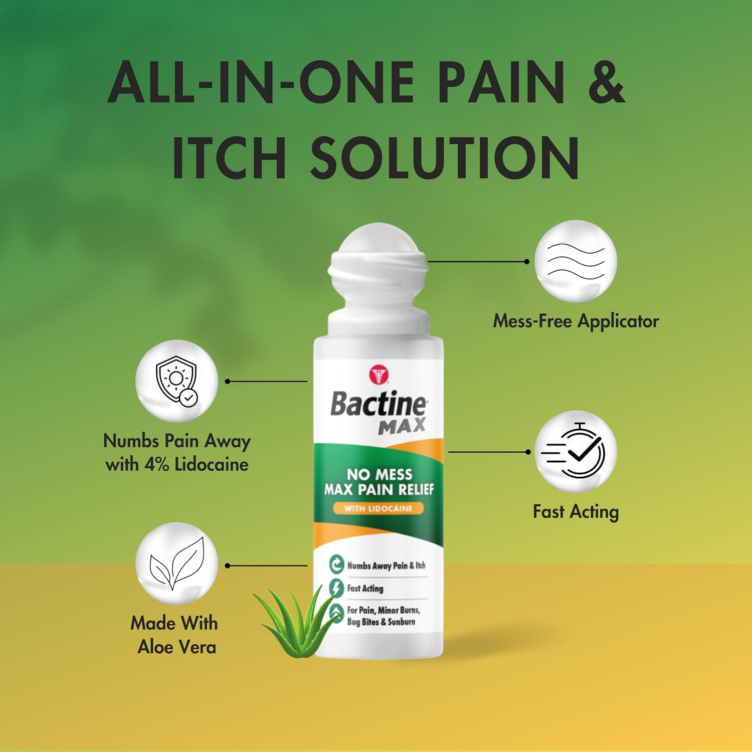 About this item MAX RELIEF FOR PAIN & ITCH: Bactine MAX is an all-in-one pain relief with lidocaine. Bactine MAX numbing cream, lidocaine sprays & roll on lidocaine cool and relieve pain & itch from poison ivy, minor cuts, scrapes, burns, bug bites & sunburn MESS-FREE APPLICATION: Our innovative lidocaine roll-on applicator ensures a mess-free and convenient application every time. Say goodbye to sticky hands and enjoy a clean, hassle-free experience with our easy-to-use roll-on design MADE WITH ALOE VERA: Our gentle roll on pain relief is infused with Aloe Vera to instantly cool, soothe and relieve your skin within seconds. Dries quickly & leaves no sticky residue FIRST AID KIT MUST HAVE: Accidents happen, be prepared. Keep your first aid supplies stocked with Bactine MAX. Whether it’s a scraped knee, blistered heel or itchy bug bite, this topical anesthetic provides relief where you need it most TRUSTED FOR OVER 70 YEARS: With a legacy spanning over 70 years, Bactine has been the go-to choice for families seeking the best first aid available. Safe for adults and children 2 years old plus FSA/HSA Eligible › See more product details,MAX RELIEF FOR PAIN & ITCH: Bactine MAX is an all-in-one pain relief with lidocaine. Bactine MAX numbing cream, lidocaine sprays & roll on lidocaine cool and relieve pain & itch from poison ivy, minor cuts, scrapes, burns, bug bites & sunburn,MESS-FREE APPLICATION: Our innovative lidocaine roll-on applicator ensures a mess-free and convenient application every time. Say goodbye to sticky hands and enjoy a clean, hassle-free experience with our easy-to-use roll-on design,MADE WITH ALOE VERA: Our gentle roll on pain relief is infused with Aloe Vera to instantly cool, soothe and relieve your skin within seconds. Dries quickly & leaves no sticky residue,FIRST AID KIT MUST HAVE: Accidents happen, be prepared. Keep your first aid supplies stocked with Bactine MAX. Whether it’s a scraped knee, blistered heel or itchy bug bite, this topical anesthetic provides relief where you need it most,TRUSTED FOR OVER 70 YEARS: With a legacy spanning over 70 years, Bactine has been the go-to choice for families seeking the best first aid available. Safe for adults and children 2 years old plus,FSA/HSA Eligible