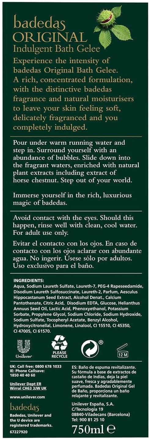 About this item Badedas Original Bath Gelle 750ml by Badedas Brand : Badedas Product type: BATHWATER ADDITIVE 750 ml Pack of 1 indulgent shower body bath gel › See more product details,Badedas Original Bath Gelle 750ml by Badedas,Brand : Badedas,Product type: BATHWATER ADDITIVE,750 ml Pack of 1,indulgent shower body bath gel