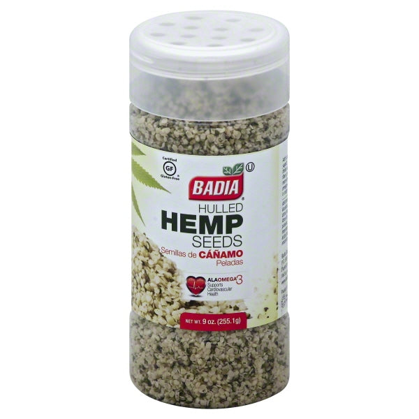 Badia Hemp Seeds, Hulled. Hemp Seeds, Hulled ALA Omega 3: Supports cardiovascular health. Certified gluten-free. Add a rich, nutty flavor to your smoothies, yogurt, cereal, salads and more with these nutritious gluten-free seeds, high in fiber, protein, omega-3 fatty acids and, more importantly, super abundant in omega-6 fatty acid (GLA), difficult to find in many other foods. Visit our website: www.badiaspices.com. Please recycle! Packed in USA