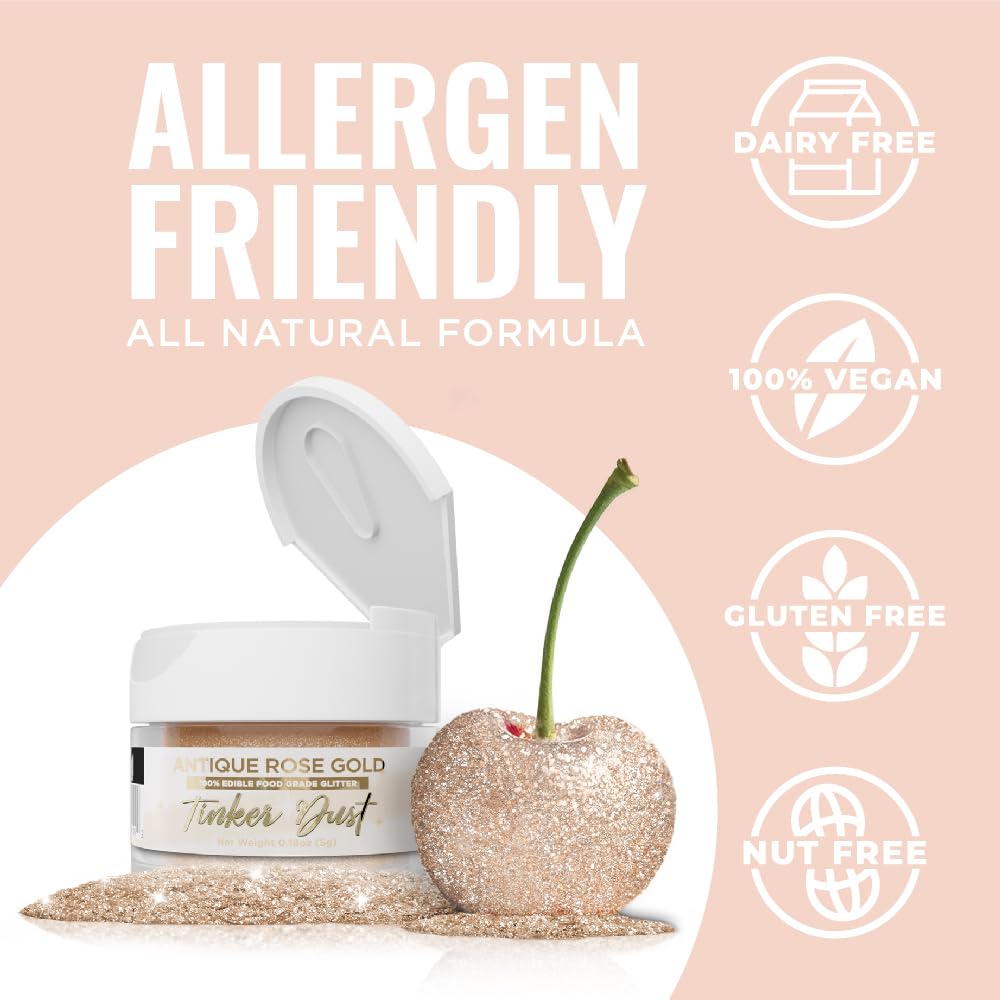 Antique Rose Gold Tinker Dust is a beautiful, food grade edible glitter made with larger particles than Luster Dust to give it that “glitter look!" Perfect for cake decorating, cupcakes, cookies, fruit and even beverages! The convenient flip-cap jar design ensures precise application to your culinary creations. This Tinker Dust is vegan, gluten free, dairy free, nut free and GMO free. Whether you're a professional baker, a passionate home cook, or a mixologist, Tinker Dust is a seamless way to infuse a sparkle into your edible creations, adding a visually appealing touch to every treat,?? Dual Use: When you buy Bakell's Tinker Dust, you're getting two products for the price of one! Tinker Dust (except certain golds) can be used as both a cake decorating dust and a beverage garnish! Add it to your favorite cocktail or soft drink to create a silky, shimmering effect that swirls your beverage to life!,?? Our Tinker Dusts come in over 40 colors, ensuring you’ll find the perfect hue for cakes and vegan paint applications for any occasion,?? ?? Perfect for professional bakers, home cooks, and mixologists, Tinker Dust seamlessly infuses an enchanting sparkle into your confections and beverages,?? We are the only edible glitter company whose products are made in the USA at SQF III, GMP, Halal, & Kosher certified facilities, & are nut free, gluten free, & vegan,?? Perfect for gender reveal parties, holidays, birthdays, weddings, graduations, cakes, cocktails, mocktails, cookies, desserts, beer, garnishes, juice, teas, lemonade, coffee, & even crafts!,?? The convenient flip-cap design provides ease and precision of Tinker Dust for your drinks,??? Bakell prioritizes your health by carefully selecting the highest quality ingredients, to create the safest and best product on the market. Our Tinker Dust is also gluten free, dairy free, GMO free and vegan,?? The convenient flip-cap design provides ease and precision of Tinker Dust for your confections and drinks,? Upgrade Your Sparkle: Tinker Dust’s extra-large, mica-based particles deliver a bold, eye-catching glitter effect, outshining the subtle, powdery sheen of Luster Dust with striking brilliance