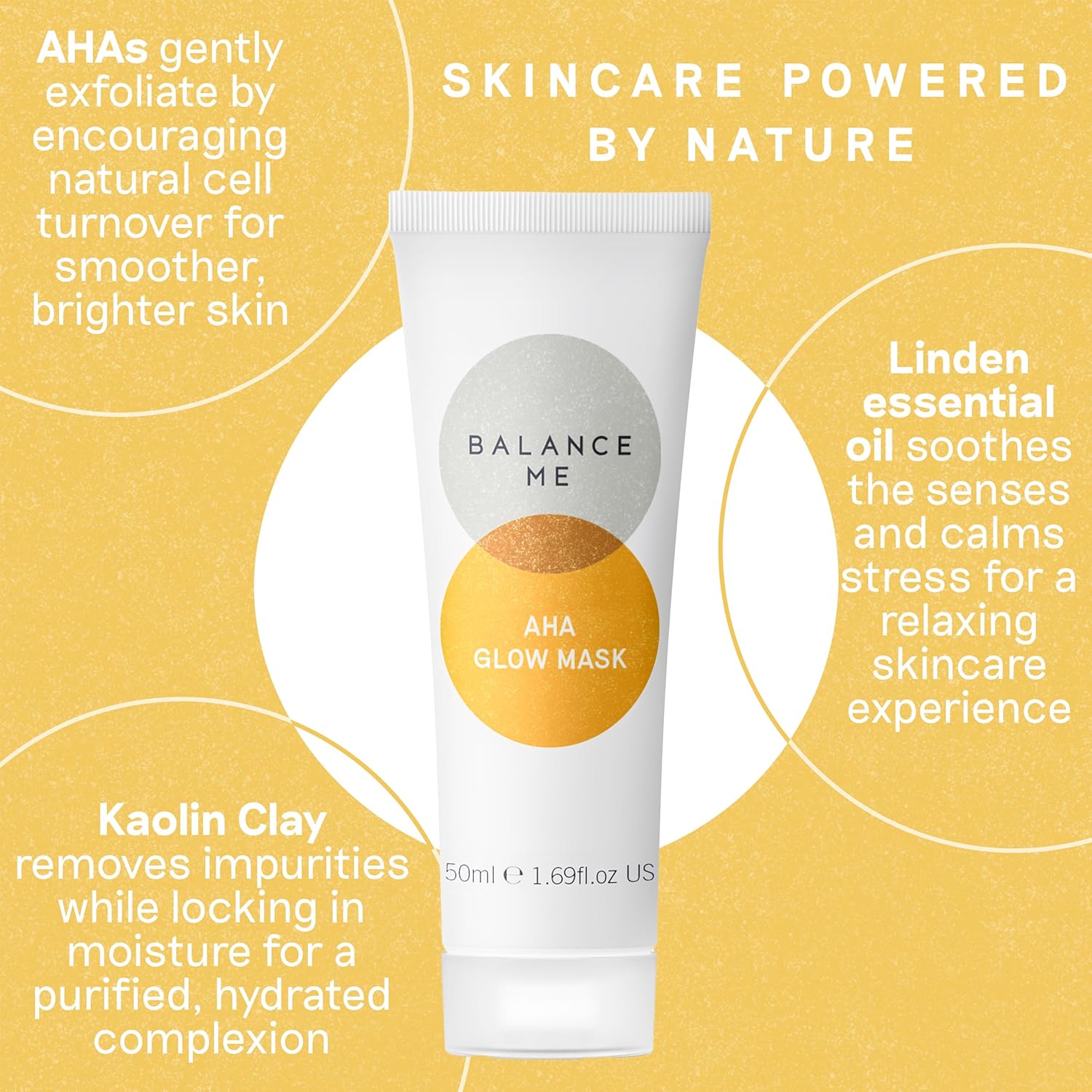Balance Me Aha Glow Face Mask 50Ml, With Glycolic Acid, Brightening & Purifying Clay Mask, Triple-Action Exfoliation, Anti-Aging, Radiant Skin