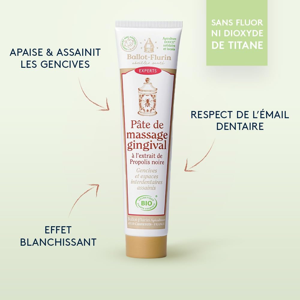 Tested under the supervision of a stomatologist: soothes sensitive gums (73 %), soothes irritations (71 %), cleans the gums and spaces between the teeth (71 %), reduces bleeding and redness (69 %) French propolis certified 100 % organic, from our hives and local micro-terroirs Harvested locally in the countryside using low-tech, gentle, non-polluting extraction methods Patent pending n°07 56648 Small-scale production of no more than 270 units per month. No added salt, no fluorine, and no preservatives or colourings