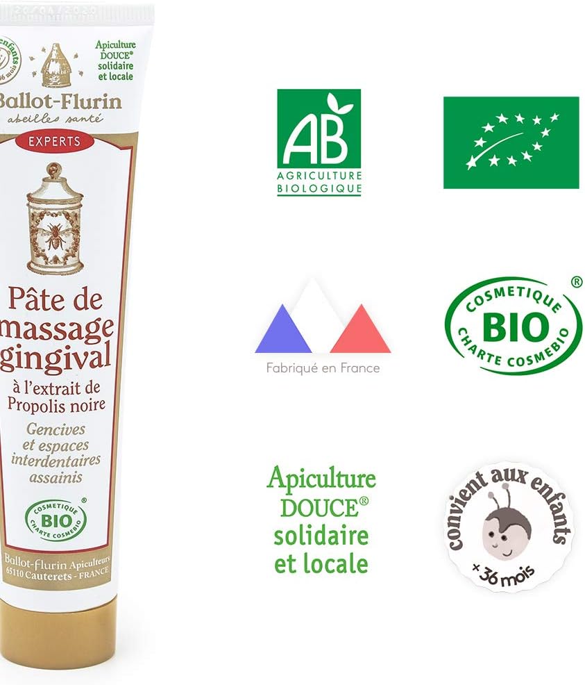 Product description This is a professional treatment that contains very natural ingredients, with French black propolis, for healthy gums. Cleans sensitive gums thanks to the antibacterial properties of black propolis which reduces signs of gum inflammation redness, bleeding, and cleans the spaces between the teeth. This formula provides a gentle and effective massage, with natural cleaning and polishing agents that remove dental plaque by way of a non-aggressive mechanical process. Ingredients Extrait de propolis blanche* 28,8%, glycérine végétale*, carbonate de calcium, sirop de maltitol, extrait de propolis noire* 3,1%, carraghénane, sauge officinale* 0,1%, gomme xanthane. Propolis extract*, Calcium carbonate, Hydrogenated Starch hydrolysate, Glycerin*, Alcohol*, Carrageenan, Propolis Cera*, Salvia Officinalis Oil*, Xanthan Gum. *ingrédients issus de l'Agriculture Biologique. P.when('A').execute(function(A) { A.on('a:expander:toggle_description:toggle:collapse', function(data) { window.scroll(0, data.expander.$expander[0].offsetTop-100); }); }); Directions Apply a pea-sized amount of the paste on your finger and massage the gum towards the tooth. Leave to act, then brush your teeth and the spaces between the teeth. Rinse. Safety Warning For external use only. Do not swallow. Keep out of reach of children. Discontinue use and consult a dentist if irritation occurs. See more,Cleans gums and space between teeth,Bio Cosmebio, Qualité France,Apply a pea-sized amount of the paste on your finger and massage the gum towards the tooth. Leave to act, then brush your teeth and the spaces between the teeth. Rinse. May be used every day,Box contents: 75 millilitres,Tested under the supervision of a stomatologist: soothes sensitive gums (73 %), soothes irritations (71 %), cleans the gums and spaces between the teeth (71 %), reduces bleeding and redness (69 %) French propolis certified 100 % organic, from our hives and local micro-terroirs Harvested locally in the countryside using low-tech, gentle, non-polluting extraction methods Patent pending n°07 56648 Small-scale production of no more than 270 units per month. No added salt, no fluorine, and no preservatives or colourings,vegetable glycerine, calcium carbonate, maltitol syrup, melissa officinalis* 15 %, water, peppermint* 4 %, silica, extract of black propolis* 3.1 %, sodium cocoyl glutamate, carrageenan, salvia officinalis* 0.1%. * Organic ingredients. Organic cosmetic product: 100 % of the ingredients are from natural sources, of which 22.2 % are from organic farming. Controlled production process. Characteristics certified by Bureau Veritas Certification 92046 Paris La Défense, France. In accordance with I.305 quality standards: Organic and ecological cosmetic products,This is a professional treatment that contains very natural ingredients, with French black propolis, for healthy gums. Cleans sensitive gums thanks to the antibacterial properties of black propolis which reduces signs of gum inflammation (redness, bleeding), and cleans the spaces between the teeth. This formula provides a gentle and effective massage, with natural cleaning and polishing agents that remove dental plaque by way of a non-aggressive mechanical process