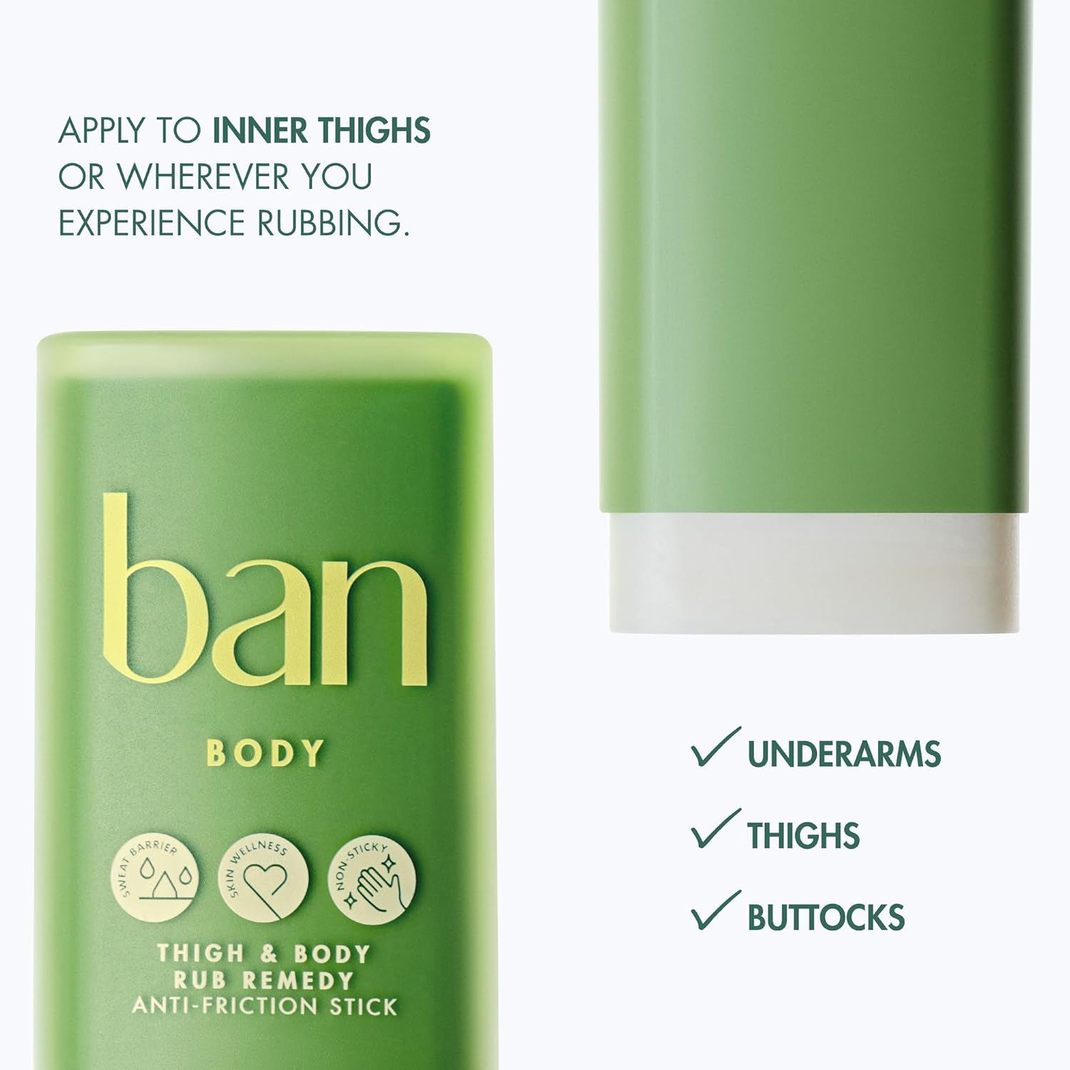 About this item FRICTION FREE REMEDY - Move comfortably, confidently with Ban anti chafing cream, getting you where you need to go without fear of friction ALUMINUM FREE FORMULA - This non toxic leg chafing prevention is free of baking soda, talc, oil, parabens, phosphate, phthalate, dyes, alcohol and gluten MESS FREE APPLICATION - Our mess free anti chafing balm uses tapioca starch to absorb moisture, and aloe vera and calendula to soothe skin GENTLE FOR SENSITIVE SKIN - Try this dermatologist tested body and thigh chafing prevention wherever skin can rub together and cause discomfort CRUELTY FREE AND VEGAN - We don’t test on animals or use animal products in this anti chafe balm formula, making it cruelty free and vegan too › See more product details,FRICTION FREE REMEDY - Move comfortably, confidently with Ban anti chafing cream, getting you where you need to go without fear of friction,ALUMINUM FREE FORMULA - This non toxic leg chafing prevention is free of baking soda, talc, oil, parabens, phosphate, phthalate, dyes, alcohol and gluten,MESS FREE APPLICATION - Our mess free anti chafing balm uses tapioca starch to absorb moisture, and aloe vera and calendula to soothe skin,GENTLE FOR SENSITIVE SKIN - Try this dermatologist tested body and thigh chafing prevention wherever skin can rub together and cause discomfort,CRUELTY FREE AND VEGAN - We don’t test on animals or use animal products in this anti chafe balm formula, making it cruelty free and vegan too