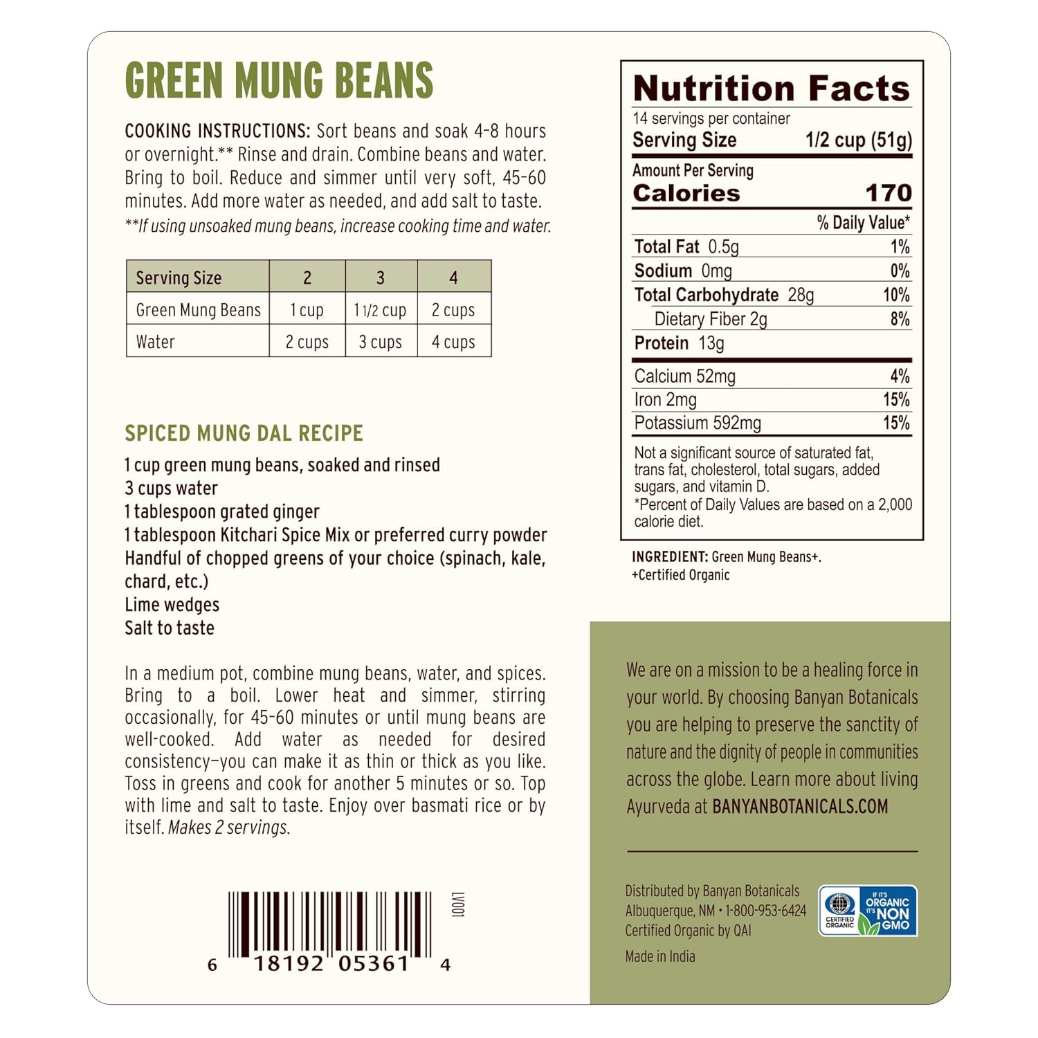 Whole Mung Beans (Green Gram) Mung beans are an essential and healthful ingredient for the Ayurvedic kitchen. Mung beans have been cultivated throughout India for at least 4,000 years, and they have served as a staple food in many cultures across Asia for nearly as long. They are well known to be easy on the digestive system, and they are often suitable for people who don’t typically tolerate legumes. Mung beans nourish and strengthen the tissues of the body while gently removing naturally occurring toxins. With 13 g of protein in each serving, mung beans support a well-rounded diet, especially for vegetarians, vegans, and those with an active lifestyle. Sprouts are wonderful little crunchy treats that are a popular addition to a balanced diet. Bean sprouts of all types are full of potential. Try them in your next salad, stir fry, or as a snack all on their own! Nutritious, easy to digest, and delicious. Satisfying to eat, easy to prepare, and fun to watch grow! Directions for Sprouting Green Mung Beans Please note: A sprouting jar is not necessary, but it does make the process easy! You can find these at your local health food store. You can also use a jar and cheesecloth or even a fine-meshed colander. For a quart-sized jar, soak 1/4–1/3 cup mung beans with 3 times as much water as beans. Soak 6–8 hours, then drain completely. Rinse with fresh, lukewarm water. Ideal sprouting temperature is 70 degrees. Place the jar upside down and at an angle to drain completely. Cover jar with towel to keep beans dark. Gently rinse and drain the beans 2–3 times per day. Growing time will depend on the bean/seed. Green mung beans typically will be ready by day six,GREEN MUNG BEANS are a staple in the Ayurvedic kitchen, offering a nutritious and protein-rich ingredient for making kitchari, gluten free stew, or a simple green mung dal,VERSATILE AND EASY TO DIGEST, mung beans are easy to make and support a well-rounded diet, especially for vegetarians, vegans, and those with an active lifestyle,ENHANCE YOUR DIET by experimenting with all the ways to use mung beans. Try making green mung bean flour, sprouted mung beans, or a vegetarian slow cooker stew,BANYAN BOTANICALS is committed to producing the highest quality Ayurvedic products using USDA certified organic herbs that are sustainably sourced and fairly traded. All our products are 3rd party tested to ensure product quality and safety,THE BANYAN GUARANTEE: If for any reason you’re not satisfied with one of our products, we will gladly accept returns for a full product refund