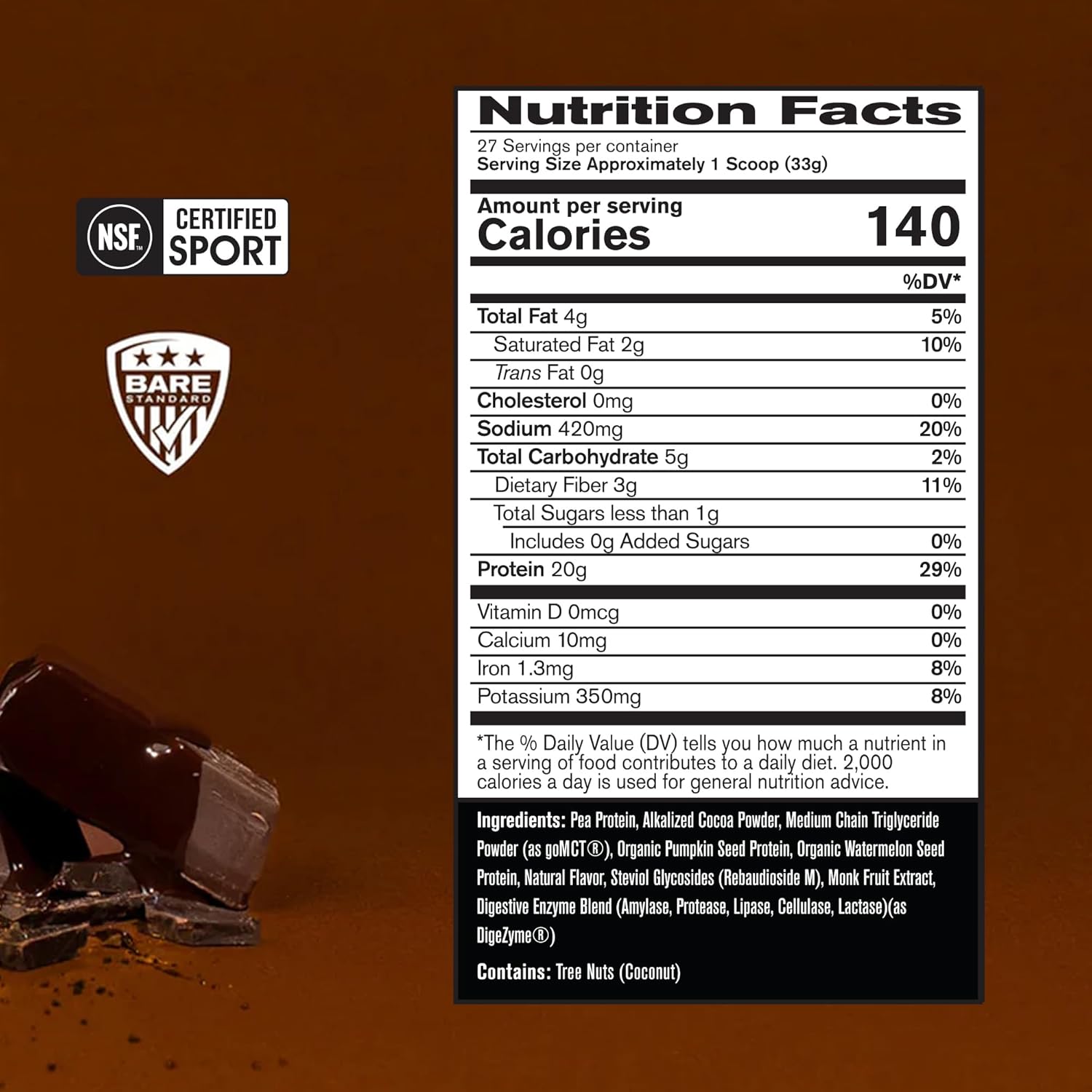 Bare Performance Nutrition Vegan Protein, Plant Based Protein, Pea Protein, Watermelon Protein And Pumpkin Protein, Naturally Sweetened And Flavored (27 Servings, Chocolate)