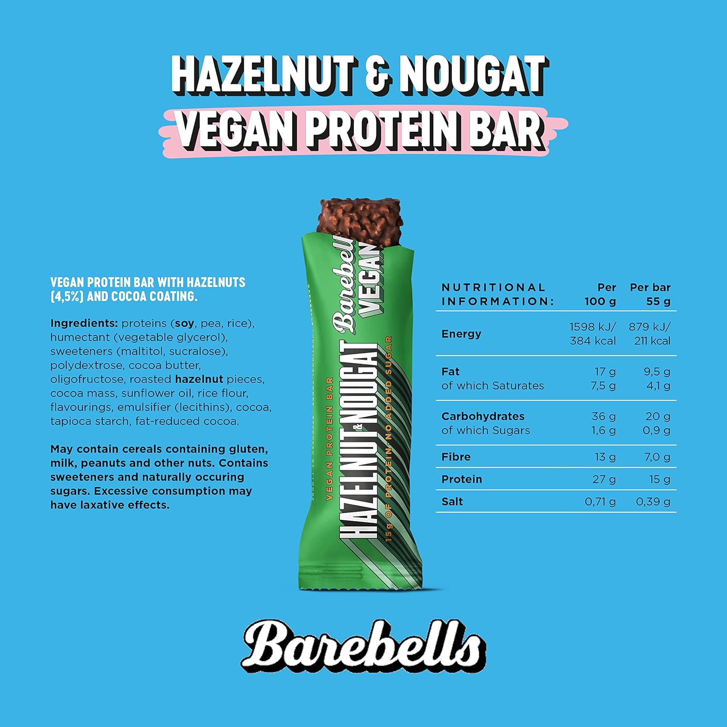 Barebells Vegan Protein Bars – Vegan Chocolate Bar With Low Carb, High Protein, Ideal For Vegan Snacks – 12 X 55G (Hazelnut Nougat)