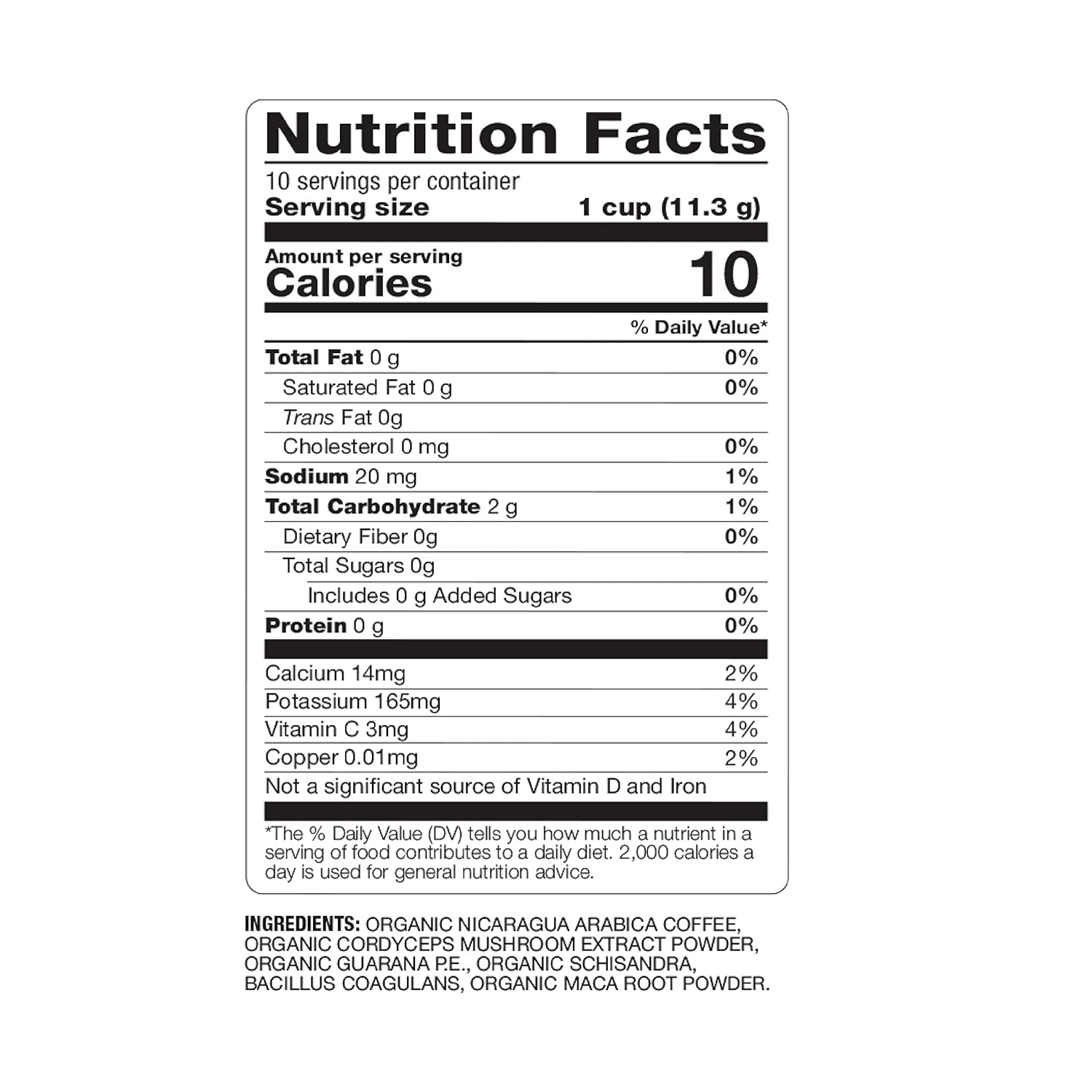 Organic Coffee: Each individual cup is infused with revitalizing maca, guarana, cordyceps mushrooms, and schisandra. Probiotics boost the impact of these handpicked nutrients by supporting digestion with every sip