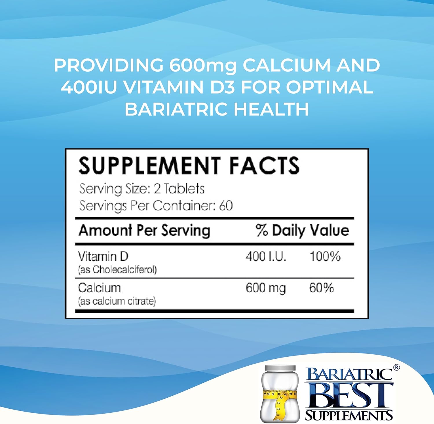 Bariatric Calcium Citrate With Vitamin D3 – Trusted Nutrition For Post-Surgery Recovery Supporting Your Body’S Recovery After Bariatric Surgery Is Essential. Bariatric Best Supplements Calcium Citrate With Vitamin D3 Is Expertly Designed To Help You Meet Your Calcium Needs With Ease. Tailored For Individuals Recovering From Gastric Bypass , Duodenal Switch , Or Gastric Sleeve Surgeries, This Supplement Provides 600 Mg Of Calcium Citrate And 400 Iu Of Vitamin D3 Per Serving To Promote Bone Health, Muscle Function, And Overall Well-Being. Why Choose Bariatric Best Supplements  Meets Asmbs Guidelines – Specifically Aligned With The Calcium Intake Recommendations Of The American Society For Metabolic And Bariatric Surgery.  Trusted Since 2010 – Over A Decade Of Expertise In Supporting Bariatric Patients' Nutritional Needs.  Certified Quality – Manufactured In A Gmp-Certified Facility And Verified By 3Rd Party Labs For Purity And Potency.  Convenient Dosage – Easy-To-Digest Tablets; Take Two (2) Tablets Twice Daily To Meet Your Full Daily Calcium Requirements.  Gluten-Free, Non-Gmo, And Preservative-Free – Safe For Sensitive Dietary Needs.  Easy-To-Swallow Design – Coated For Comfort And Formulated With Fast Absorption Technology. Superior Absorption, Backed By Science Calcium Citrate Is The Preferred Form Of Calcium For Bariatric Patients, Offering Superior Solubility And Gentle Digestion. Paired With Vitamin D3 , Which Is Essential For Calcium Uptake, This Supplement Ensures Your Body Gets The Nutrients It Needs For Recovery And Long-Term Health. Together, They Work To Support: Stronger Bones Improved Muscle Function Cardiovascular Health Energy Metabolism Immune Support Dosage And Daily Value Explained Each Serving Of 2 Tablets Provides 600 Mg Of Calcium Citrate And 400 Iu Of Vitamin D3 , Which Covers 60% Of Your Daily Value (Dv) For Calcium . Taking The Recommended 4 Tablets Per Day (Two Servings) Ensures You Meet The 1200 Mg Daily Intake Recommended After Weight-Loss Surgery. This Clarity Helps You Optimize Your Recovery With Confidence. Safety First We Care About Your Well-Being. Please Note: If You Are Pregnant, Nursing, Or Have Specific Medical Conditions, Consult Your Healthcare Provider Before Use. Join Thousands Of Happy Customers With 120 Coated Tablets Per Bottle (60 Servings) And A Heritage Of Trust Since 2010, Bariatric Best Supplements Has Been A Leader In Supporting Post-Surgery Recovery. Add Our Calcium Citrate With Vitamin D3 To Your Cart Today And Take The Next Step Toward Optimal Health