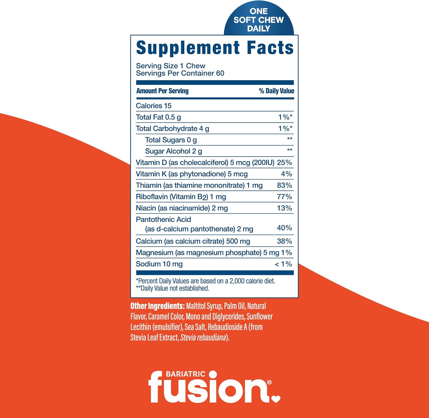 About this item Premium Bariatric Calcium Citrate Formulation: Each Bariatric Fusion bariatric calcium chew contains 500mg of Calcium Citrate with Vitamin D, Vitamin K, and Magnesium; all of which are essential for optimum bone health. These are Ideal Calcium Chewables for women and men. Great Tasting Calcium Soft Chew: The advantage of our unique chewy bite is that each delicious gummies like soft chew contains B vitamins, thiamine, riboflavin, and niacin to give your body a boost of energy. Our Calcium Citrate with Vitamin D3 Chews are designed for your daily routine. Perfect for those looking for a non chewable tablet, melt and capsule option. Great alternative to calcium citrate gummies or chewable calcium. Easy Daily Regimen: Our delicious, smooth, candy-like calcium citrate chews supplements are something to celebrate. Our Caramel flavored soft chew formulation is specifically designed anyone who is looking to improve bone health and energy. These calcium chews with vitamin d are sugar free, gluten free, and certified kosher. Practitioner Formulated: This Calcium Citrate Chewable designed for maximum absorption by a bariatric practitioner to meet the needs of their patients looking to improve digestive health. Over 15 years experience has helped us develop the best digestive products including these calcium chews for women and men on the market.* Brand You Trust: Bariatric Fusion was founded by a Bariatric Practitioner over 15 Years ago. Our goal has been to create a simple, great tasting, high quality and affordable daily vitamin regimen including these chewable calcium supplements for women for those with the most sensitive stomachs. Made in the USA from globally-sourced ingredients in GMP certified facilities. › See more product details,Premium Bariatric Calcium Citrate Formulation: Each Bariatric Fusion bariatric calcium chew contains 500mg of Calcium Citrate with Vitamin D, Vitamin K, and Magnesium; all of which are essential for optimum bone health. These are Ideal Calcium Chewables for women and men,Great Tasting Calcium Soft Chew: The advantage of our unique chewy bite is that each delicious gummies like soft chew contains B vitamins, thiamine, riboflavin, and niacin to give your body a boost of energy. Our Calcium Citrate with Vitamin D3 Chews are designed for your daily routine. Perfect for those looking for a non chewable tablet, melt and capsule option. Great alternative to calcium citrate gummies or chewable calcium,Easy Daily Regimen: Our delicious, smooth, candy-like calcium citrate chews supplements are something to celebrate. Our Caramel flavored soft chew formulation is specifically designed anyone who is looking to improve bone health and energy. These calcium chews with vitamin d are sugar free, gluten free, and certified kosher,Practitioner Formulated: This Calcium Citrate Chewable designed for maximum absorption by a bariatric practitioner to meet the needs of their patients looking to improve digestive health. Over 15 years experience has helped us develop the best digestive products including these calcium chews for women and men on the market,Brand You Trust: Bariatric Fusion was founded by a Bariatric Practitioner over 15 Years ago. Our goal has been to create a simple, great tasting, high quality and affordable daily vitamin regimen including these chewable calcium supplements for women for those with the most sensitive stomachs. Made in the USA from globally-sourced ingredients in GMP certified facilities