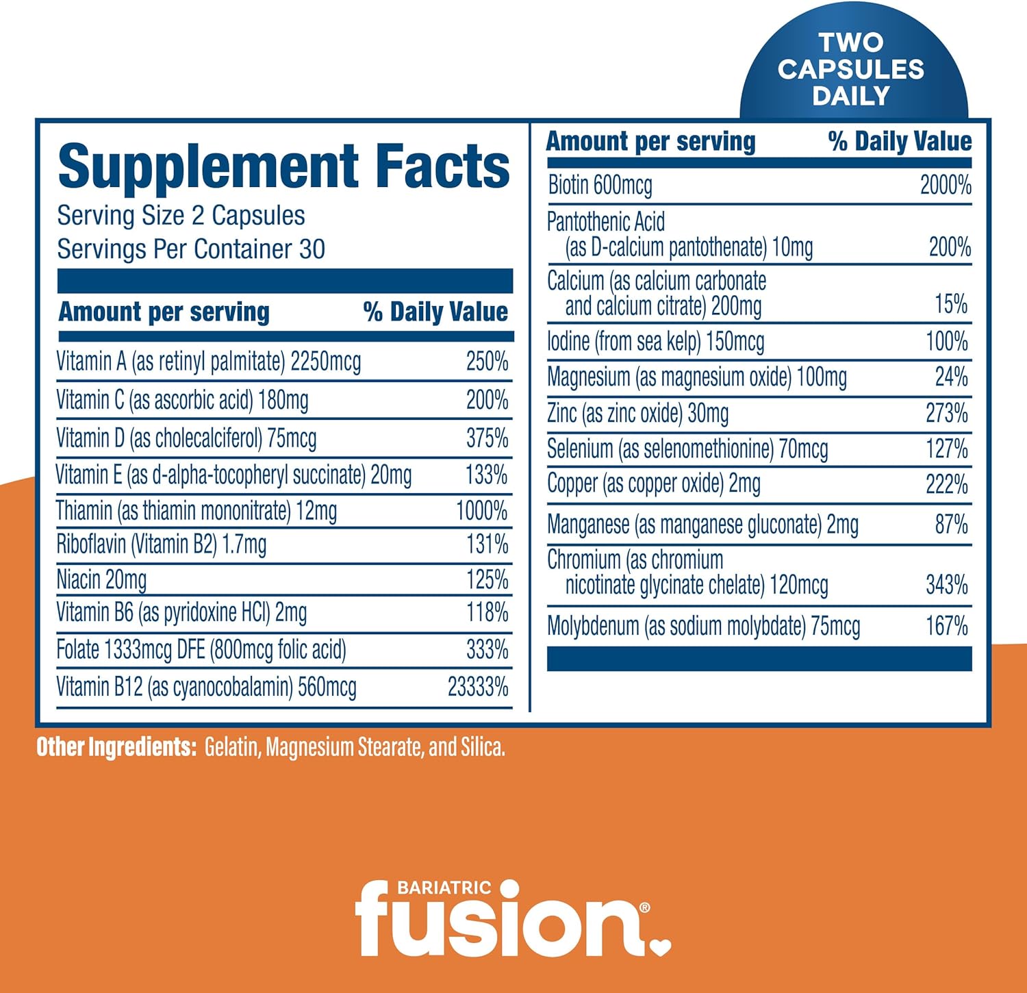 Easy Daily Regimen. Only 2 Bariatric multivitamin capsules per day for gastric bypass, sleeve gastrectomy and lap band patients