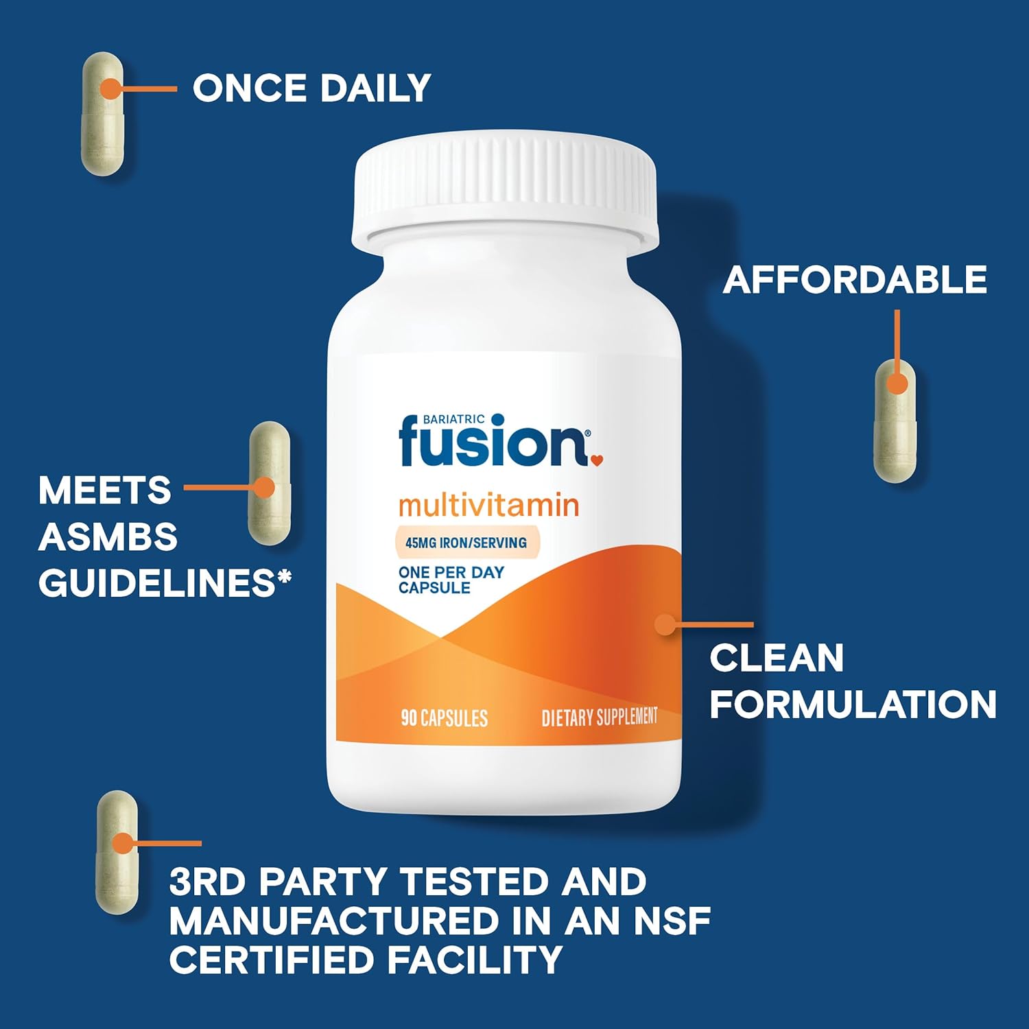About this item Premium Bariatric Multivitamin with Iron for Women and Men: A one per day daily bariatric multivitamin with Iron for Bariatric Patients. Each capsule contains the highest amounts of 21 Bariatric specific essential vitamins and minerals required after bariatric surgery that meets or exceeds ASMBS guidelines. Easy Daily Regimen: Only One per day easy to swallow Bariatric Vitamin for post WLS Patients. This a great Supplement option for those looking to avoid chalky bariatric multivitamin chewables, gummy vitamins, liquid vitamins and melts. Bariatric multivitamin with iron for women and men. Each capsule contains 45mg Iron, Vitamin D, Biotin, Zinc, Copper, Vitamin B12 and more. Affordable: Our Fusion Vitamins for Bariatric Patients comes in sizes of 1, 3, and 12 Month options. For customers who know that they want an easy daily vitamin, we have the best options for you. We believe a daily multi should be affordable for all bariatric patients. Each bottle is sugar and gluten free. Formulated by a Bariatric Team: Bariatric surgery must haves designed for maximum absorption by a bariatric surgical team. Over15 years experience has helped us develop the best bariatric products on the market. Designed specifically for gastric bypass, sleeve gastrectomy, duodenal switch, and lap band patients for maximum absorption.* Brand You Trust: Bariatric Fusion was founded by a Bariatric Practitioner over 15 Years ago. Our goal has been to create a simple, great tasting, and affordable daily vitamin regimen for bariatric patientsā post-surgery. We are committed to providing the highest quality bariatric vitamins. Our products are Made in the USA from globally-sourced ingredients in GMP certified facilities. āŗ See more product details,Premium Bariatric Multivitamin with Iron for Women and Men: A one per day daily bariatric multivitamin with Iron for Bariatric Patients. Each capsule contains the highest amounts of 21 Bariatric specific essential vitamins and minerals required after bariatric surgery that meets or exceeds ASMBS guidelines,Easy Daily Regimen: Only One per day easy to swallow Bariatric Vitamin for post WLS Patients. This a great Supplement option for those looking to avoid chalky bariatric multivitamin chewables, gummy vitamins, liquid vitamins and melts. Bariatric multivitamin with iron for women and men. Each capsule contains 45mg Iron, Vitamin D, Biotin, Zinc, Copper, Vitamin B12 and more,Affordable: Our Fusion Vitamins for Bariatric Patients comes in sizes of 1, 3, and 12 Month options. For customers who know that they want an easy daily vitamin, we have the best options for you. We believe a daily multi should be affordable for all bariatric patients. Each bottle is sugar and gluten free,Formulated by a Bariatric Team: Bariatric surgery must haves designed for maximum absorption by a bariatric surgical team. Over15 years experience has helped us develop the best bariatric products on the market. Designed specifically for gastric bypass, sleeve gastrectomy, duodenal switch, and lap band patients for maximum absorption,Brand You Trust: Bariatric Fusion was founded by a Bariatric Practitioner over 15 Years ago. Our goal has been to create a simple, great tasting, and affordable daily vitamin regimen for bariatric patientsā post-surgery. We are committed to providing the highest quality bariatric vitamins. Our products are Made in the USA from globally-sourced ingredients in GMP certified facilities