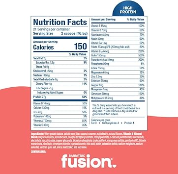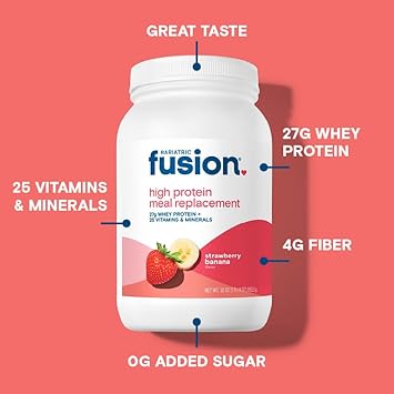 About this item Great-tasting and may help curb appetite! This meal replacement is extremely smooth and delicious with 27 grams of the highest quality whey protein isolate. Perfect for Bariatric patients before and after bariatric surgery. This includes Gastric Bypass, Sleeve Gastrectomy, DS and Lap Band. The suggested use is to combine 2 scoops of Bariatric Fusion High Protein Meal Replacement with 4-6 fl. oz of water, milk, or your favorite beverage and thoroughly mix in a blender or shaker. For a milkshake-like consistency, add 4-6 ice cubes., blend until smooth. Contains all essential amino acids.! This meal replacement shake is an excellent Bariatric Multivitamin! It has a creamy texture that's excellent and each tub contains 21 servings. Designed by a bariatric surgical team specifically made for gastric bypass, sleeve gastrectomy, duodenal switch, and lap band patients for maximum absorption. Made in the USA from globally-sourced ingredients! Absolutely no aspartame, gluten or sugar. This powder is also low carb, low calorie and contains 4 grams of fiber! › See more product details,Great-tasting and may help curb appetite! This meal replacement is extremely smooth and delicious with 27 grams of the highest quality whey protein isolate. Perfect for Bariatric patients before and after bariatric surgery. This includes Gastric Bypass, Sleeve Gastrectomy, DS and Lap Band,The suggested use is to combine 2 scoops of Bariatric Fusion High Protein Meal Replacement with 4-6 fl. oz of water, milk, or your favorite beverage and thoroughly mix in a blender or shaker. For a milkshake-like consistency, add 4-6 ice cubes., blend until smooth,Contains all essential amino acids.! This meal replacement shake is an excellent Bariatric Multivitamin! It has a creamy texture that's excellent and each tub contains 21 servings,Designed by a bariatric surgical team specifically made for gastric bypass, sleeve gastrectomy, duodenal switch, and lap band patients for maximum absorption,Made in the USA from globally-sourced ingredients! Absolutely no aspartame, gluten or sugar. This powder is also low carb, low calorie and contains 4 grams of fiber!