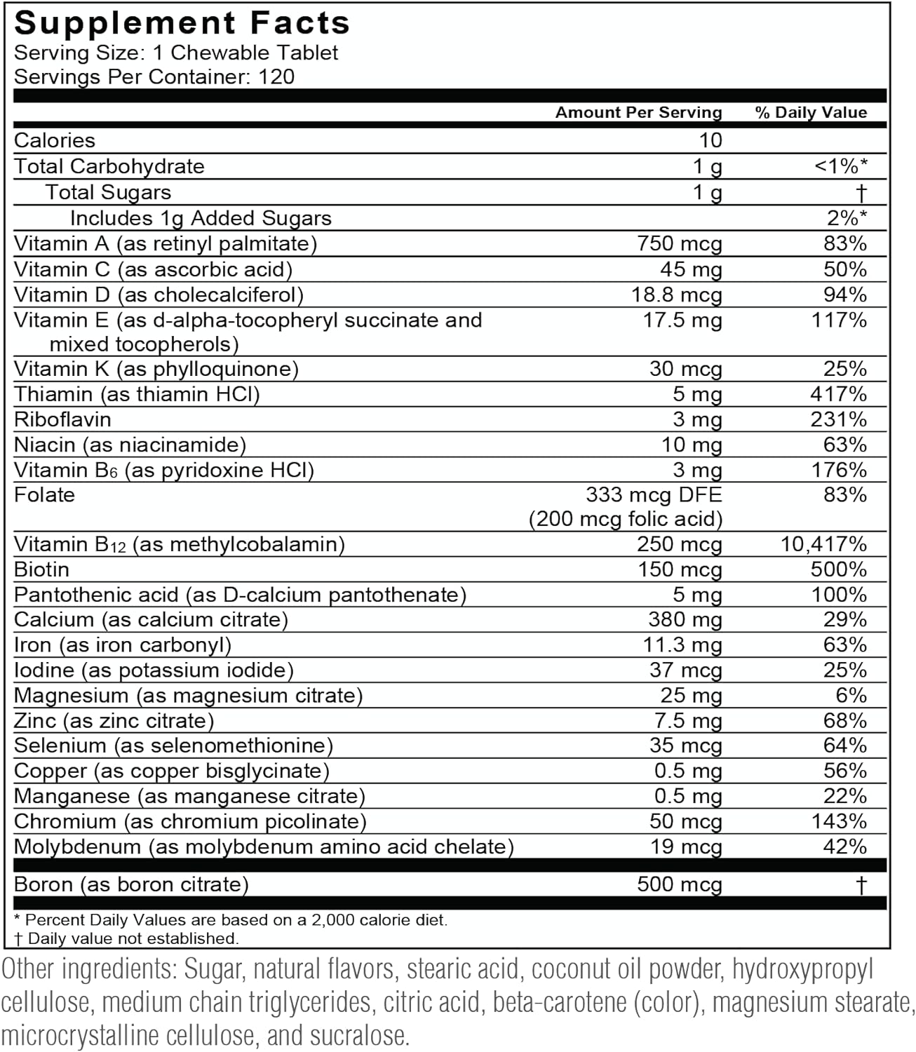 Affordable ALL-IN-ONE formula. No other vitamin supplementation is needed! Replace all of your bariatric vitamins with one bottle of BariatricPal ALL-IN-ONE and get better results!It contains calcium citrate. That’s a form of calcium that you can take with or without food. It’s gentler on the stomachIt has non-heme iron in the form of iron carbonyl. That means you can take it with calcium without worrying about a reduction in iron or calcium statusIt has high amounts of more than 20 essential vitamins and minerals, including vitamin B12, thiamin (vitamin B1), biotin, and zinc. This complete chewable also includes vitamins C, E, and A, other B vitamins, and iodine, manganese, copper, and chromiumBariatricPal ALL-IN-ONE Chewable Multivitamin with Calcium Citrate and Iron is proudly manufactured in a facility certified by the State of NJ Department of Health as cGMP (Certified for Good Manufacturing Practices.) Our facility has also been assessed by NSF International to be in compliance with GMP requirements in NSF/ANSI Standard 173, section 8 Dietary SupplementsYou can work hard to lose weight, but how can you get the most from your efforts? It’s critical to be well nourished! Otherwise, you may end up with nutrient deficiencies that can have effects such as interfering with metabolism, reducing energy, and causing health problems. It can be tough to get in all of your vitamins and minerals, but BariatricPal ALL-IN-ONE Chewable Multivitamin with Calcium Citrate and Iron can help! BariatricPal ALL-IN-ONE Chewable Multivitamin with Calcium Citrate and Iron is different from other multivitamin and mineral supplements because they include calcium citrate and iron in the same supplement. And BariatricPal ALL-IN-ONE Chewable Multivitamin with Calcium Citrate and Iron has some special features to make it easier for you to take your vitamins! The vitamins and minerals in BariatricPal ALL-IN-ONE Chewable Multivitamin with Calcium Citrate and Iron may help:** Maintain normal metabolism and energy. Promote healthy bones, joints, blood, and heart. Support normal mood. Support healthy wound healing and immunity. Maintain cellular integrity and antioxidant functions. Promote healthy hair, skin, and nails. BariatricPal Multivitamin ALL-IN-ONE Chewables are based on the latest post-op guidelines from the American Society for Metabolic and Bariatric Surgery (ASMBS) to provide more than 20 essential vitamins and minerals. BariatricPal Multivitamin ALL-IN-ONE is especially high in nutrients such as calcium, iron, vitamins B12 and D, folic acid, and biotin, which are known to be at risk for bariatric surgery patients. *A 2015 study of over 300 bariatric patients by multiple bariatric surgeons suggests that bariatric supplements may be taken without separating the non-heme iron and calcium citrate allowing simplification of the postoperative regimen and, hopefully, increasing patient compliance