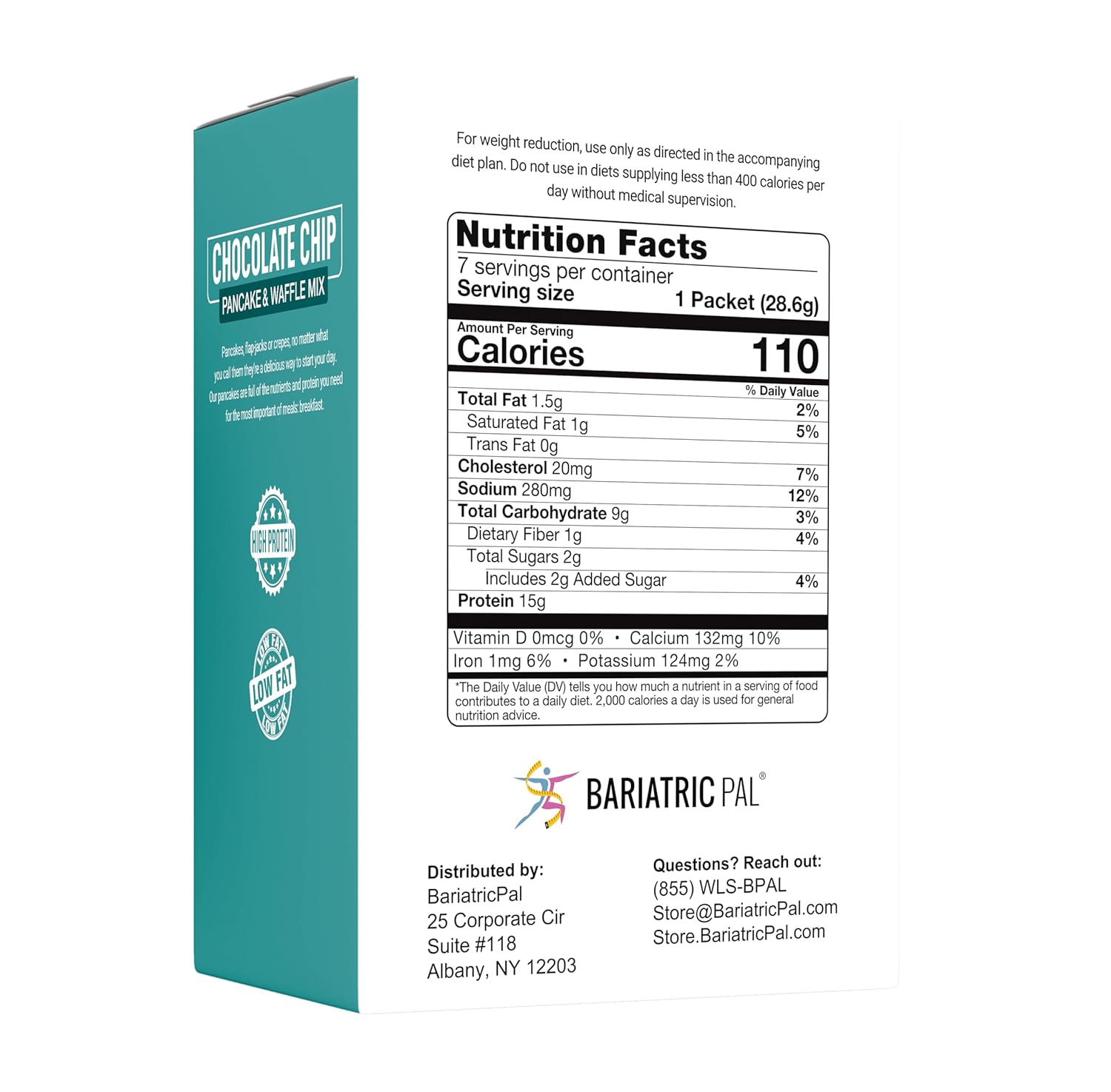15 grams protein, 100 caloriesLow fat, low carb, 10% of the daily value for calciumAspartame-freeSuitable for Solid Foods, Weight Loss, and Maintenance dietsSuitable for gastric sleeve, gastric bypass, duodenal switch and gastric band patients or for anyone watching their weightWho can resist chocolate chip pancakes? You don’t have to with BariatricPal Chocolate Chip Pancakes. For 100 calories, you can have fluffy low-carb pancakes with indulgent chocolate chips. Each serving has 15 grams of protein. There’s no need to make a whole batch. You can make one serving at a time in just minutes to get your perfect weight loss day off to an energizing start