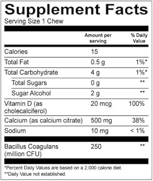 38% of the daily value for calcium per chew (500 mg), 500mg Calcium as Citrate per chew, 100% of the daily value for vitamin D (800 IU), 250 million CFU ProbioticsSugar-free and no artificial sweetenersSuitable for Solid Foods, Maintenance, and Back-on-Track diets. Also suitable for Gastric Band, Gastric Sleeve, and Gastric Bypass patientsEnjoy three (3) delicious 500 mg calcium citrate chews per day! 90 chews per bag. Each bag is a month supply for Gastric Bypass and Sleeve patientsManufactured in an FDA inspected facility. Kosher (OU-D)