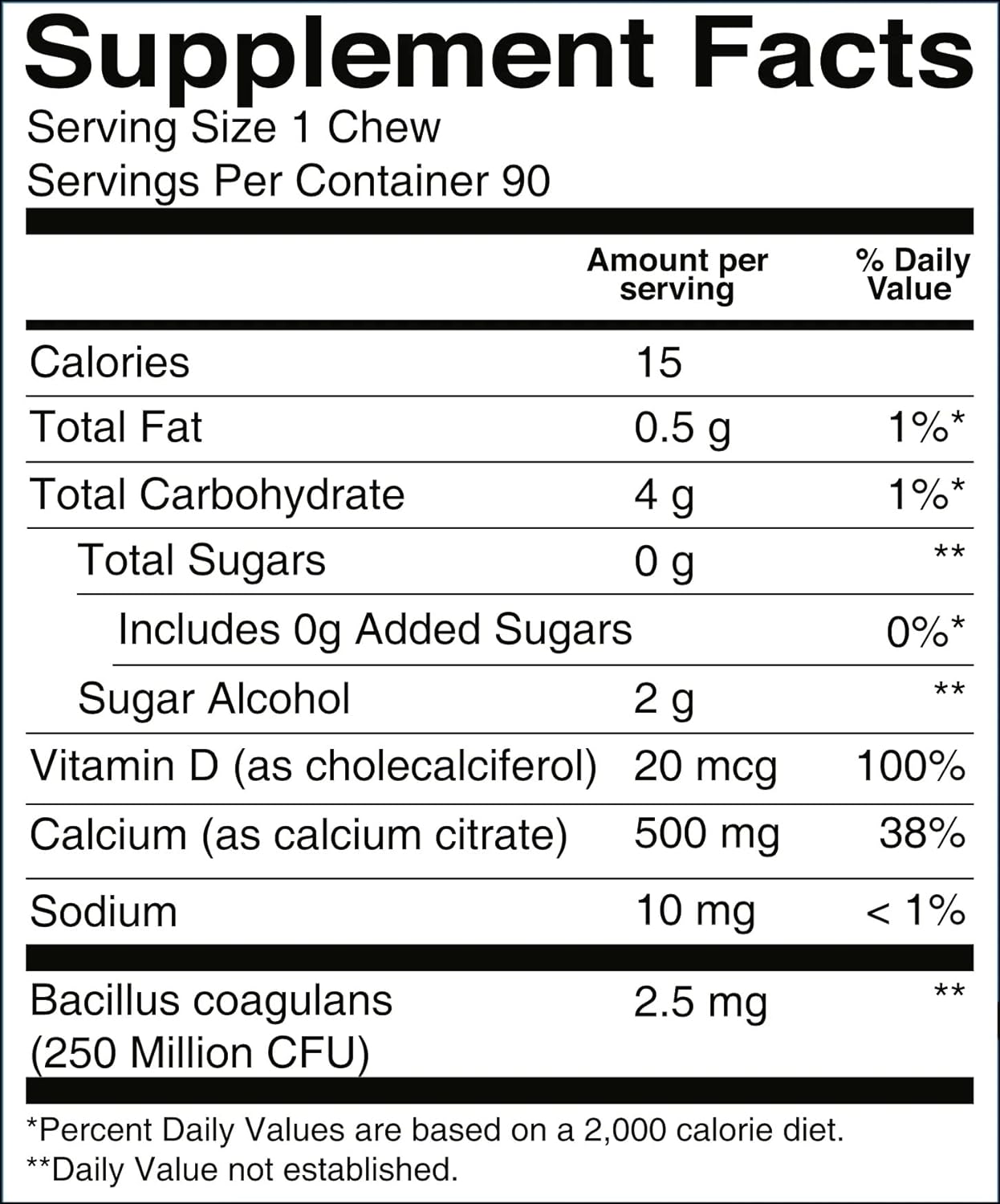 38% of the daily value for calcium per chew (500 mg), 500mg Calcium as Citrate per chew, 100% of the daily value for vitamin D (800 IU), 250 million CFU ProbioticsSugar-free and no artificial sweetenersSuitable for Solid Foods, Maintenance, and Back-on-Track diets. Also suitable for Gastric Band, Gastric Sleeve, and Gastric Bypass patientsEnjoy three (3) delicious 500 mg calcium citrate chews per day! 90 chews per bag. Each bag is a month supply for Gastric Bypass and Sleeve patientsManufactured in an FDA inspected facility. Kosher (OU-D)