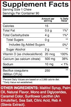 38% of the daily value for calcium per chew (500 mg), 500mg Calcium as Citrate per chew, 100% of the daily value for vitamin D (800 IU), 250 million CFU ProbioticsSugar-free and no artificial sweetenersSuitable for Solid Foods, Maintenance, and Back-on-Track diets. Also suitable for Gastric Band, Gastric Sleeve, and Gastric Bypass patientsEnjoy three (3) delicious 500 mg calcium citrate chews per day! 90 chews per bag. Each bag is a month supply for Gastric Bypass and Sleeve patientsManufactured in an FDA inspected facility. Kosher (OU-D)