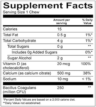 38% of the daily value for calcium per chew (500 mg), 500mg Calcium as Citrate per chew, 100% of the daily value for vitamin D (800 IU), 250 million CFU ProbioticsSugar-free and no artificial sweetenersSuitable for Solid Foods, Maintenance, and Back-on-Track diets. Also suitable for Gastric Band, Gastric Sleeve, and Gastric Bypass patientsEnjoy three (3) delicious 500 mg calcium citrate chews per day! 90 chews per bag. Each bag is a month supply for Gastric Bypass and Sleeve patientsManufactured in an FDA inspected facility. Kosher (OU-D)