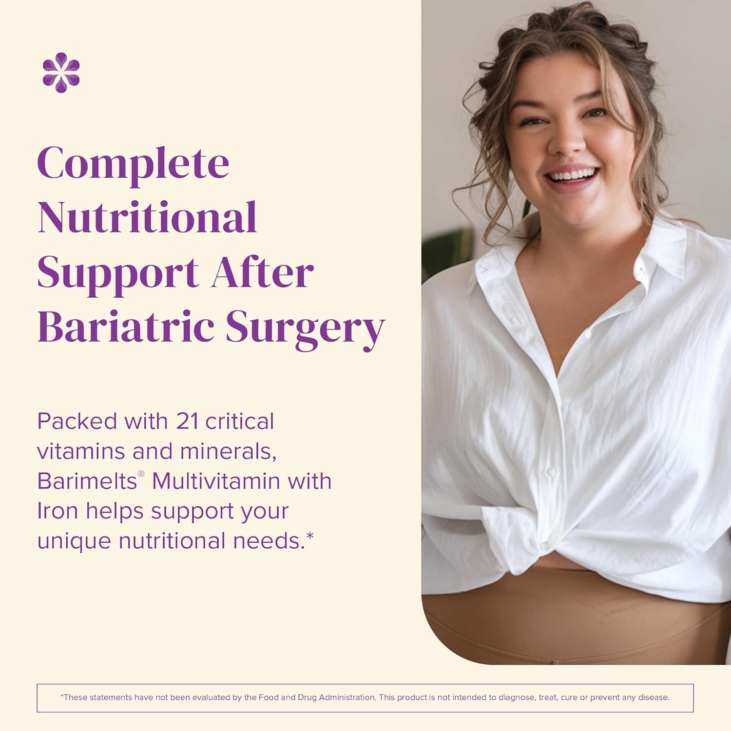 About this item Post-bariatric-surgery multivitamin for women: Barimelts’ great-tasting, fast-dissolving multivitamin with iron is tailored to meet the unique nutritional demands of bariatric patients after surgery while being gentle on the stomach? Bariatric must-haves: Formulated with 21 vitamins and minerals including optimal forms of key ingredients such as folate as methylfolate, B12 methylcobalamin, and gentle-on-the-stomach carbonyl iron? Easy to take: We formulated an enjoyable way to stick to your vitamin routine after bariatric surgery with tasty melt-in-your-mouth tablets that ensure nutrients are readily available for absorption after ingestion, just take 2 tablets daily? Formulated with you in mind: Available in our smooth natural blueberry flavor, our women’s multivitamin is sugar-free, gluten-free, dairy-free, non-GMO and contains only natural sweeteners and flavors? Committed to quality and care: Barimelts bariatric vitamins follow ASMBS guidelines, are produced in our NSF-certified GMP facility, and undergo third-party testing for potency and purity? › See more product details,Post-bariatric-surgery multivitamin for women: Barimelts’ great-tasting, fast-dissolving multivitamin with iron is tailored to meet the unique nutritional demands of bariatric patients after surgery while being gentle on the stomach?,Bariatric must-haves: Formulated with 21 vitamins and minerals including optimal forms of key ingredients such as folate as methylfolate, B12 methylcobalamin, and gentle-on-the-stomach carbonyl iron?,Easy to take: We formulated an enjoyable way to stick to your vitamin routine after bariatric surgery with tasty melt-in-your-mouth tablets that ensure nutrients are readily available for absorption after ingestion, just take 2 tablets daily?,Formulated with you in mind: Available in our smooth natural blueberry flavor, our women’s multivitamin is sugar-free, gluten-free, dairy-free, non-GMO and contains only natural sweeteners and flavors?,Committed to quality and care: Barimelts bariatric vitamins follow ASMBS guidelines, are produced in our NSF-certified GMP facility, and undergo third-party testing for potency and purity?