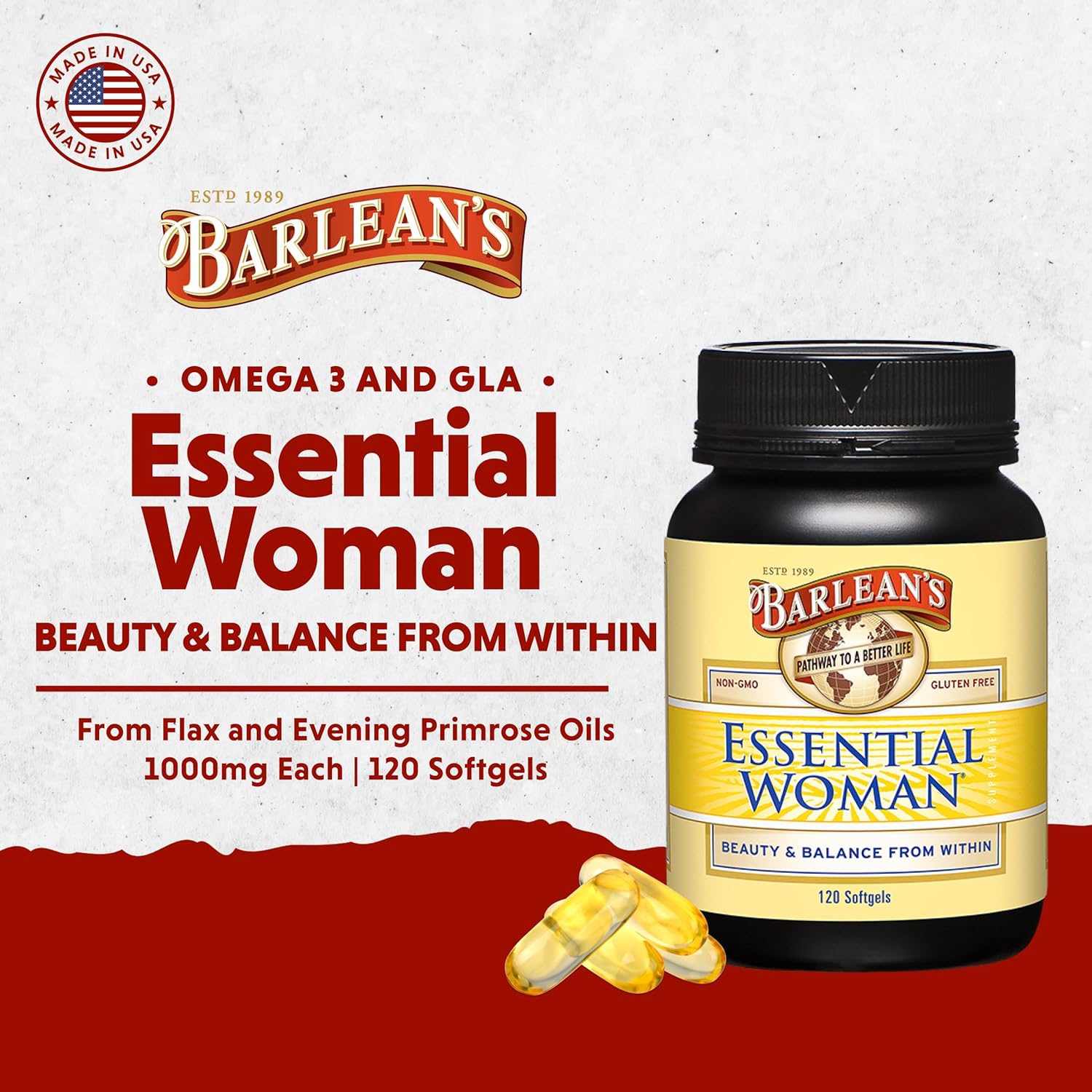 Barlean'S Essential Woman Supplement Capsules, Women'S Flaxseed And Evening Primrose Oil For Hormone Balance, Omega 3 6 9 And Gla Acid, 120 Count