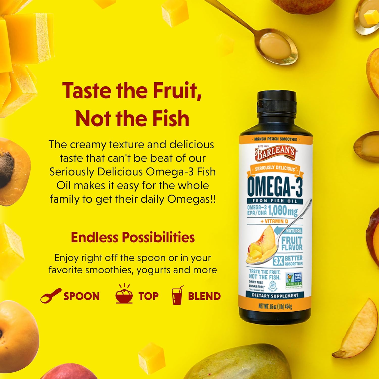 About this item TASTE THE FRUIT, NOT THE FISH: Yummy fruity flavored fish oil with a creamy smoothie texture that both kids and adults love is the secret behind Barlean's Omega 3 fish oil liquid. Our omega supplement features a smooth and delectable Mango Peach flavor, 1080 mg of EPA/DHA essential fatty acids per serving and 600 IUs (15 mcg) of vitamin D3 with no artificial flavors, colors or sweeteners. Our fish oil is dairy free, sugar free and non-GMO HIGH ABSORPTION WITHOUT FISH BURPS: We make Seriously Delicious Omega 3's with a proprietary process that turns wild caught, ultra purified fish oil into a creamy and delicious omega 3 supplement which is highly absorbable and free of mercury and other heavy metals. Because of our emulsified process Barlean's omega swirl is easier to digest, more absorbable, and doesn't result in fish burps HEALTHY DIET FOR PICKY EATERS: Omega-3's are essential to a healthy diet, that's why Barlean's has made nutrition easier for kids and adults by making natural supplements aimed at satisfying even the pickiest eaters. Each serving includes EPA and DHA fatty acids which may help to support brain, eye, heart, joint, and immune system health so that you can maintain an active and healthy everyday lifestyle DELICIOUS DAILY NUTRITION: Our burpless fish oil tastes great straight off of the spoon, drizzled over yogurt, or used in oatmeal or smoothies. For adults and children ages 4 and up, take 1 Tbsp daily. Keep out of reach of young kids ages 3 and younger, and never give to pets. Refrigerate after opening A NAME YOU KNOW AND TRUST: Barlean's has been selling premium fish oil Omega 3 supplements since 1989, which is more than 30 years of helping people live their healthiest lives! We are passionate about healthy oils and helping people. Proudly made in the USA โบ See more product details,TASTE THE FRUIT, NOT THE FISH: Yummy fruity flavored fish oil with a creamy smoothie texture that both kids and adults love is the secret behind Barlean's Omega 3 fish oil liquid. Our omega supplement features a smooth and delectable Mango Peach flavor, 1080 mg of EPA/DHA essential fatty acids per serving and 600 IUs (15 mcg) of vitamin D3 with no artificial flavors, colors or sweeteners. Our fish oil is dairy free, sugar free and non-GMO,HIGH ABSORPTION WITHOUT FISH BURPS: We make Seriously Delicious Omega 3's with a proprietary process that turns wild caught, ultra purified fish oil into a creamy and delicious omega 3 supplement which is highly absorbable and free of mercury and other heavy metals. Because of our emulsified process Barlean's omega swirl is easier to digest, more absorbable, and doesn't result in fish burps,HEALTHY DIET FOR PICKY EATERS: Omega-3's are essential to a healthy diet, that's why Barlean's has made nutrition easier for kids and adults by making natural supplements aimed at satisfying even the pickiest eaters. Each serving includes EPA and DHA fatty acids which may help to support brain, eye, heart, joint, and immune system health so that you can maintain an active and healthy everyday lifestyle,DELICIOUS DAILY NUTRITION: Our burpless fish oil tastes great straight off of the spoon, drizzled over yogurt, or used in oatmeal or smoothies. For adults and children ages 4 and up, take 1 Tbsp daily. Keep out of reach of young kids ages 3 and younger, and never give to pets. Refrigerate after opening,A NAME YOU KNOW AND TRUST: Barlean's has been selling premium fish oil Omega 3 supplements since 1989, which is more than 30 years of helping people live their healthiest lives! We are passionate about healthy oils and helping people. Proudly made in the USA