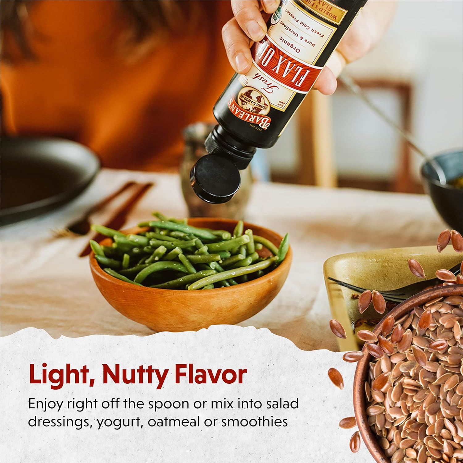 PURE, ORGANIC AND UNREFINED: Barlean's organic flax oil is cold pressed without the use of heat or solvents. Each drop is protected from damaging heat and light from seed to bottle, offering a potent and healthy balance of Omegas 3, 6, and 9 and a pleasant and mild nutty flavor