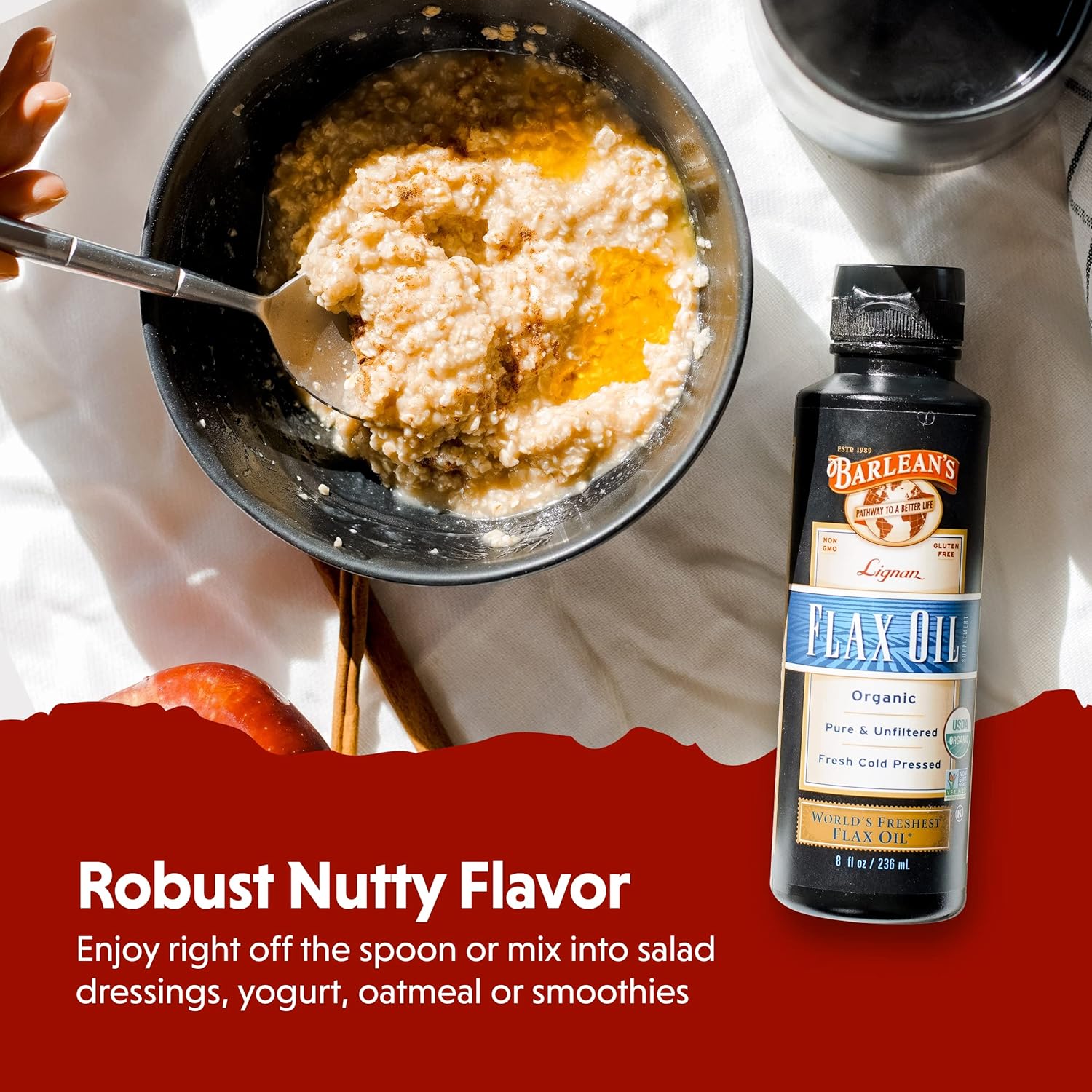 About this item PURE, ORGANIC AND UNREFINED: Enjoy a potent and healthy balance of Omegas 3, 6 and 9 with a tasty flavor with our Organic Lignan Flax Oil! A natural source of SDG lignan, our flax oil is cold pressed without the use of heat or solvents, each drop is protected from damaging heat and light from seed to bottle, offering a pleasant and mild nutty flavor, and our flaxseed oil features 7,230 mg per Tbsp of ALA Omega-3 fatty acid FRESH QUALITY FLAX SEEDS: Barlean's unfiltered flax oil is made from quality organic non-GMO flax seeds which are 100% vegan, kosher and gluten free. Nutrition is made easier through our natural supplements aimed at satisfying even the pickiest eaters who might not want to take hard to swallow capsules to maintain an active and healthy lifestyle RICH WITH LIGNANS: Lignans are fiber solids from the hull of flax seeds, and are powerful plant polyphenols (think green tea and red wine) which may help promote heart and circulatory health, and may help support healthy joints. Lignan flax oil is unfiltered and contains particles of the whole seed, which like to settle at the bottom of the bottle. This oil can range in color from gold or amber to dark brown, and has a coarser texture along with a more robust flax flavor DELICIOUS DAILY NUTRITION: Our flax seed oil tastes great straight off of the spoon, or mixed into salad dressings, yogurt, oatmeal or smoothies. Take 1 to 2 Tbsp daily. Keep out of reach of children, and never give to pets. Refrigerate after opening. The expiration date is printed on the bottom back of every bottle, next to the manufacture date (MFG). Please do not confuse the two. Always refer to the expiration date (EXP) to confirm product freshness A NAME YOU KNOW AND TRUST: Barlean's has been selling premium flax oil Omega 3 supplements since 1989, which is more than 30 years of helping people live their healthiest lives! We are passionate about healthy oils and helping people. Proudly made in the USA › See more product details,PURE, ORGANIC AND UNREFINED: Enjoy a potent and healthy balance of Omegas 3, 6 and 9 with a tasty flavor with our Organic Lignan Flax Oil! A natural source of SDG lignan, our flax oil is cold pressed without the use of heat or solvents, each drop is protected from damaging heat and light from seed to bottle, offering a pleasant and mild nutty flavor, and our flaxseed oil features 7,230 mg per Tbsp of ALA Omega-3 fatty acid,FRESH QUALITY FLAX SEEDS: Barlean's unfiltered flax oil is made from quality organic non-GMO flax seeds which are 100% vegan, kosher and gluten free. Nutrition is made easier through our natural supplements aimed at satisfying even the pickiest eaters who might not want to take hard to swallow capsules to maintain an active and healthy lifestyle,RICH WITH LIGNANS: Lignans are fiber solids from the hull of flax seeds, and are powerful plant polyphenols (think green tea and red wine) which may help promote heart and circulatory health, and may help support healthy joints. Lignan flax oil is unfiltered and contains particles of the whole seed, which like to settle at the bottom of the bottle. This oil can range in color from gold or amber to dark brown, and has a coarser texture along with a more robust flax flavor,DELICIOUS DAILY NUTRITION: Our flax seed oil tastes great straight off of the spoon, or mixed into salad dressings, yogurt, oatmeal or smoothies. Take 1 to 2 Tbsp daily. Keep out of reach of children, and never give to pets. Refrigerate after opening. The expiration date is printed on the bottom back of every bottle, next to the manufacture date (MFG). Please do not confuse the two. Always refer to the expiration date (EXP) to confirm product freshness,A NAME YOU KNOW AND TRUST: Barlean's has been selling premium flax oil Omega 3 supplements since 1989, which is more than 30 years of helping people live their healthiest lives! We are passionate about healthy oils and helping people. Proudly made in the USA
