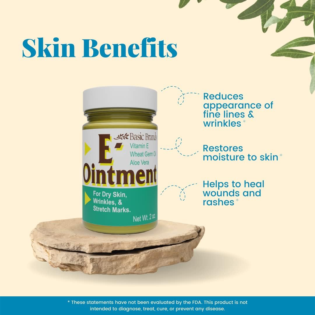 Ointment contains Vitamin E, wheat germ oil and aloe vera; helps to protect tissue from damage caused by free radicals*; free radicals lead to symptoms of aging such as wrinklesHelps reduce appearance of fine lines, wrinkles, dark spots, stretch marksHelps restore moisture to skin, beneficial for rashes; strengthens brittle nails, removes makeupNon-GMO; no phthalates, propylene glycol, sulfates and dyesIncludes one 2 oz bottle; Manufactured in the USA, produced in small batches