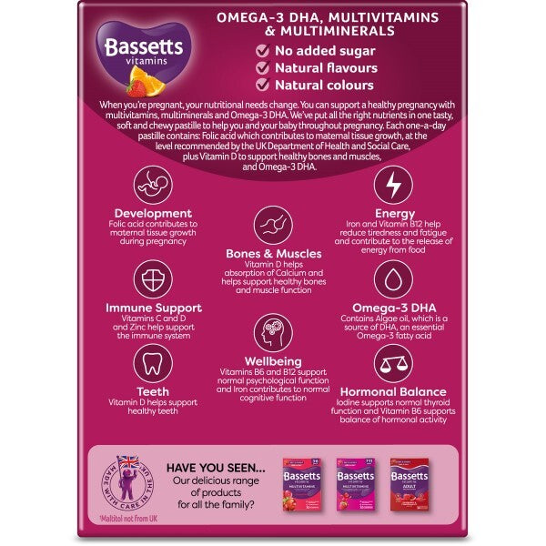 Product Information:Deliciously chewy one-a-day multivitamin and multimineral pastilles designed to give your body the help you’re looking for in supporting your health and living life to the full,Features:Bassetts Vitamins are supporting women’s health with the Royal College of Obstetricians and Gynaecologists (registered charity no. 213280). Bassetts Vitamins Pregnancy Omega-3 DHA, Multivitamins & Multiminerals contains nutrients including Folic acid, which contributes to maternal tissue growth during pregnancy. •Deliciously chewy Strawberry & Orange flavour one-a-day multivitamins, multiminerals and Omega-3 DHA pastilles •Blend of 17 vitamins, minerals & oil designed to support a healthy pregnancy •Contains Folic acid which contributes to maternal tissue growth, Vitamin D to support healthy bones and muscles and Omega-3 DHA •No added sugar, Natural flavours, Natural colours •Bassetts Vitamins are supporting women’s health with the Royal College of Obstetricians and Gynaecologists (registered charity no. 213280). Bassetts Vitamins Pregnancy Omega-3 DHA, Multivitamins & Multiminerals contains nutrients including Folic acid, which contributes to maternal tissue growth during pregnancy,Benefit:DEVELOPMENT Folic acid contributes to maternal tissue growth during pregnancy BONES & MUSCLES Vitamin D helps absorption of Calcium and helps support healthy bones and muscle function ENERGY Iron and Vitamin B12 help reduce tiredness and fatigue and contribute to the release of energy from food IMMUNE SUPPORT Vitamins C and D and Zinc help support the immune system OMEGA-3 DHA Contains Algae oil, which is a source of DHA, an essential Omega-3 fatty acid TEETH Vitamin D helps support healthy teeth HORMONAL BALANCE Iodine supports normal thyroid function and Vitamin B6 supports balance of hormonal activity WELLBEING Vitamins B6 and B12 support normal psychological function and Iron contributes to normal cognitive function,Warning or Restrictions:Contains Maltitol and Sorbitol which are polyols – excessive consumption may cause a laxative effect. Contains Iron which, if taken in excess, may be harmful to very young children. Food supplements should not be used as a substitute for a balanced, varied diet and healthy lifestyle. Not suitable for children under the age of 12. KEEP OUT OF THE REACH OF CHILDREN,Product Specification:Sweeteners (Maltitol syrup, Sorbitol, Sucralose), Gelatine (Bovine), Ascorbic acid, Oil from the micro-algae Schizochytrium sp., Colours (Anthocyanins, Mixed carotenes), Acid (Malic acid), Strawberry flavouring, Dexpanthenol, Orange flavouring, Emulsifier (SOYA lecithin), Glazing agent [Vegetable oil (Coconut oil, Palm kernel oil, Sunflower oil), Carnauba wax], Ferrous citrate, Nicotinamide, Riboflavin 5-phosphate sodium, Pyridoxine hydrochloride, Zinc citrate, Pteroylmonoglutamic acid, Thiamin hydrochloride, Cupric citrate, d-Biotin, Potassium iodate, Phylloquinone, Sodium selenite, Cholecalciferol, Cyanocobalamin. Contains naturally occurring sugars,Product Uses:One pastille daily. Do not exceed the suggested daily intake,Tips and Advice:When you’re pregnant, your nutritional needs change. You can support a healthy pregnancy with multivitamins, multiminerals and Omega-3 DHA. We’ve put all the right nutrients in one tasty, soft and chewy pastille to help you and your baby throughout pregnancy. Each one-a-day pastille contains: Folic acid which contributes to maternal tissue growth, at the level recommended by the UK Department of Health and Social Care, plus Vitamin D to support healthy bones and muscles, and Omega-3 DHA