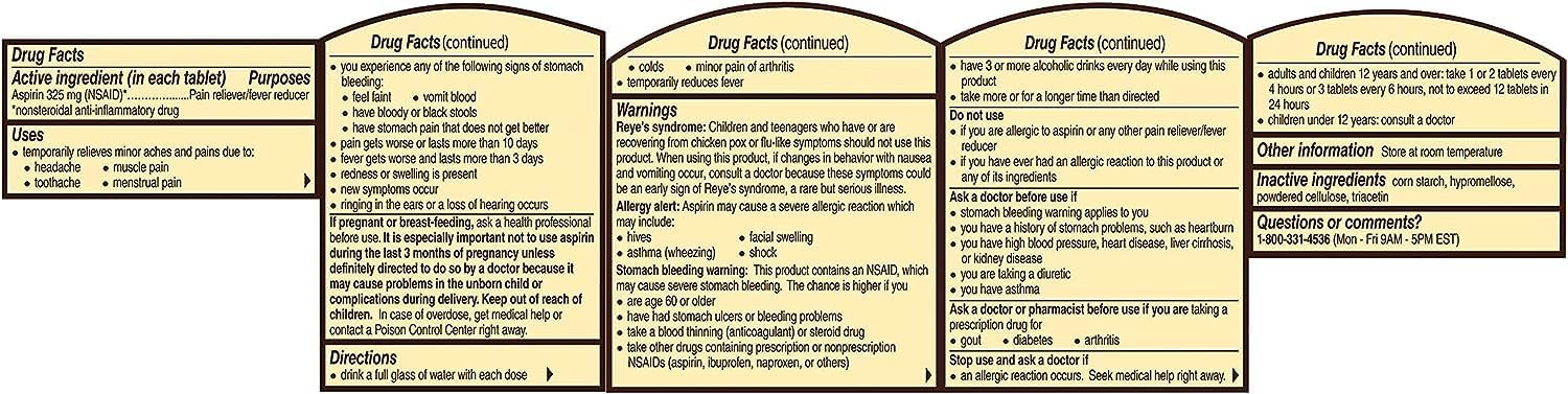 4 >Bayer Genuine Aspirin 325mg helps to relieve pain to headache, menstrual pain, minor pain of arthritis, muscle pain, toothaches, pain due to colds and reduces fever