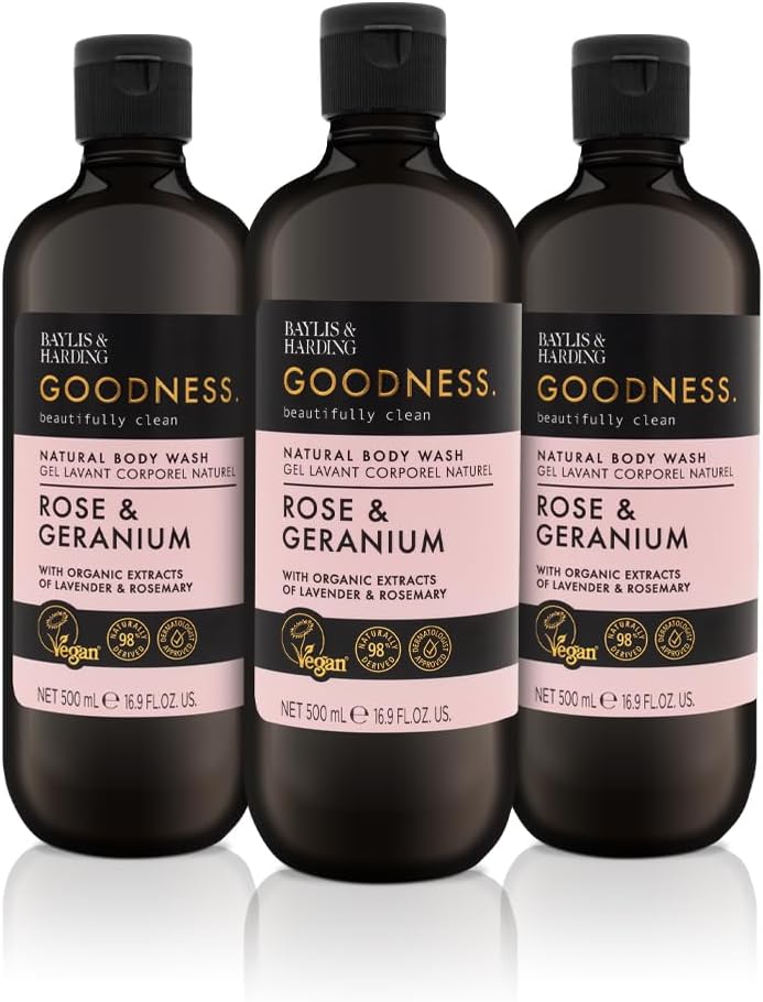 Baylis & Harding Goodness Rose & Geranium Toiletries Bundle: 3 X 500 Ml Hand Wash & 3 X 500 Ml Body Wash (6 Bottles) - Vegan Friendly
