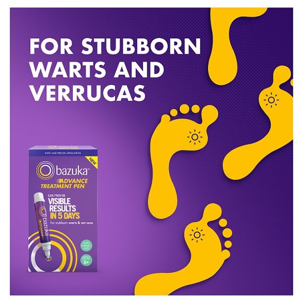 Product Details Bazuka Advance Treatment Pen Is Indicated For The Treatment Of Stubborn Warts And Verrucas On The Hands And Feet. It Is Suitable For Use By Adults And Children From 8 Years Old And Can Provide Visible Results In 5 Days. It Has A Precision Tip For Easy And Targeted Application To Protect Healthy Skin Around The Wart Or Verruca. Warts And Verrucas Are Small Excessive Growths In The Skin Caused By The Human Papilloma Virus (Hpv). Warts Often Occur On The Fingers, Or On The Back Of The Hands. You Can Recognise The Common Wart By The Rough âCauliflower-Likeâ Appearance Of The Surface. Verrucas Occur Most Often On The Sole Of The Foot. They Can Be Painful, And Often Look Like A Small White Ring Of Skin With Black Dots In The Centre. The Virus Is Very Infectious. This Means That Warts And Verrucas Can Grow And Spread, Particularly If Left Untreated. The Virus Can Also Be Transferred To Other Parts Of The Body Or From One Person To Another. How Bazuka Advance Treatment Pen Works â Bazuka Advance Treatment Pen Is Specifically Designed For Topical Administration Directly Onto Warts And Verrucas. Following Application, The Treatment Is Immediately Absorbed Into The Wart Or Verruca. The Pen Contains Formic Acid, Which Dries Out The Infected Skin, Thereby Treating The Wart Or Verruca
