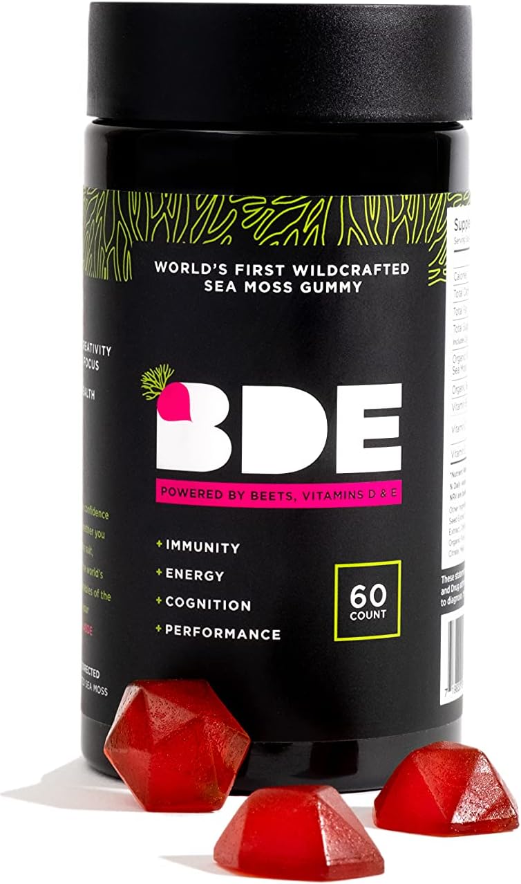 The world's first wildcrafted sea moss gummy We pick up for you the finest Gracilaria sea moss from St. Lucia and powered with beets and other natural ingredients to give you an extra boost of vitamins. Sweetened with fair trade organic cane sugar. Check out the list of powerful ingredients: Made in the USA with select ingredients thoughtfully curated from around the world. -Sea Moss is a popular superfood that comes with amazing health benefits. From aiding digestion due to our proprietary agar blend to support gut health. -Beetroot Detox the body to improve athletic performance, cognitive health & fitness goals.-Pumpkin Seed Support DNA synthesis & metabolism.- Watermelon Supports nerve, muscle & brain function. Reduces inflammation. -Maca Root Increases strength, endurance, performance. High in antioxidants to fight free radicals. Commited with the sustainability of our oceansFor every purchase made, a portion of your dollar will be donated to GreenWave.org which is centered around one focus: bringing sustainability and regenerative ocean farming to the world's oceans,ENJOY ALL ITS OVERALL HEALTH BENEFITS- From aiding digestion due to our proprietary agar blend to support weight loss & gut health. It's high in antioxidants, and supports nerve, muscle & brain function,COMPLETE VITAMIN COMPLEX FOR MEN AND WOMEN- Two BDE gummies contain as much vitamin C as 6 oranges, vitamin B12 as 7 cups of milk, B6 as 6 cups of spinach, and zinc as 3 cups of raw peas,VEGAN AND KOSHER FORMULA, ALLERGEN AND GLUTEN-FREE- Contains organic and non-GMO ingredients, all-natural and good for you like beets, pear, maca root, watermelon, pumpkin seeds, Lion's Mane mushrooms, and Panax ginseng,THESE GUMMIES CONTAIN NO ARTIFICIAL STUFF- Don't worry about gluten, gelatin, soy, nuts, shellfish, artificial sweeteners, salicylates, artificial coloring, artificial flavors, artificial preservatives, dairy products, eggs, glucose syrups, or low-grade oils. They are not here