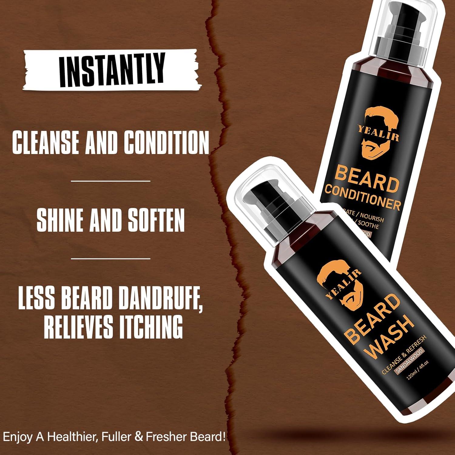 Beard Wash & Conditioner & Silicone Beard Brush Set W/Argan & Jojoba Oils - Reduce Beard Itchy, Dandruff, Beard Shampoo, Softens & Strengthens & Shine - 2 X 4 Fl Oz 120Ml