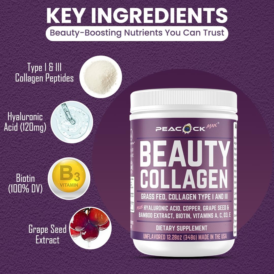 About this item Premium Collagen for Radiance: Nourish your natural glow with Type I & III collagen peptides sourced from grass-fed, pasture-raised bovine. Support beautiful skin, stronger hair, and healthier nails from within. Hyaluronic Acid & Biotin Boost: Each serving features 120mg of hyaluronic acid and 100% daily value of biotin, complemented by vitamins A, C, D3, and E. Unlock the ultimate combination for a youthful, radiant appearance. Grape Seed & Multivitamin Blend: Infused with potent grape seed extract and essential nutrients like copper, this beauty collagen powder offers a blend of anti-aging and wellness ingredients for holistic support. Pure, Clean & Certified Quality: Non-GMO and free from artificial colors, flavors, preservatives, gluten, soy, dairy, peanuts, and shellfish. Proudly made in the USA, GMP-certified, and third-party tested for uncompromising quality. Easy Mix for Beauty & Wellness: Mix effortlessly into water, smoothies, or protein drinks for a delicious addition to your daily routine. Perfect for women seeking a clean, effective solution for beauty and wellness.  See more product details,Premium Collagen for Radiance: Nourish your natural glow with Type I & III collagen peptides sourced from grass-fed, pasture-raised bovine. Support beautiful skin, stronger hair, and healthier nails from within,Hyaluronic Acid & Biotin Boost: Each serving features 120mg of hyaluronic acid and 100% daily value of biotin, complemented by vitamins A, C, D3, and E. Unlock the ultimate combination for a youthful, radiant appearance,Grape Seed & Multivitamin Blend: Infused with potent grape seed extract and essential nutrients like copper, this beauty collagen powder offers a blend of anti-aging and wellness ingredients for holistic support,Pure, Clean & Certified Quality: Non-GMO and free from artificial colors, flavors, preservatives, gluten, soy, dairy, peanuts, and shellfish. Proudly made in the USA, GMP-certified, and third-party tested for uncompromising quality,Easy Mix for Beauty & Wellness: Mix effortlessly into water, smoothies, or protein drinks for a delicious addition to your daily routine. Perfect for women seeking a clean, effective solution for beauty and wellness