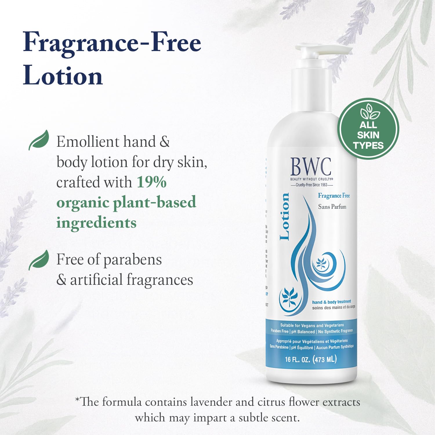 VEGAN MOISTURIZER: BWC Fragrance-Free Hand & Body Lotion for dry skin moisturizes effectively without parabens, phthalates, artificial fragrances, or animal-derived ingredients