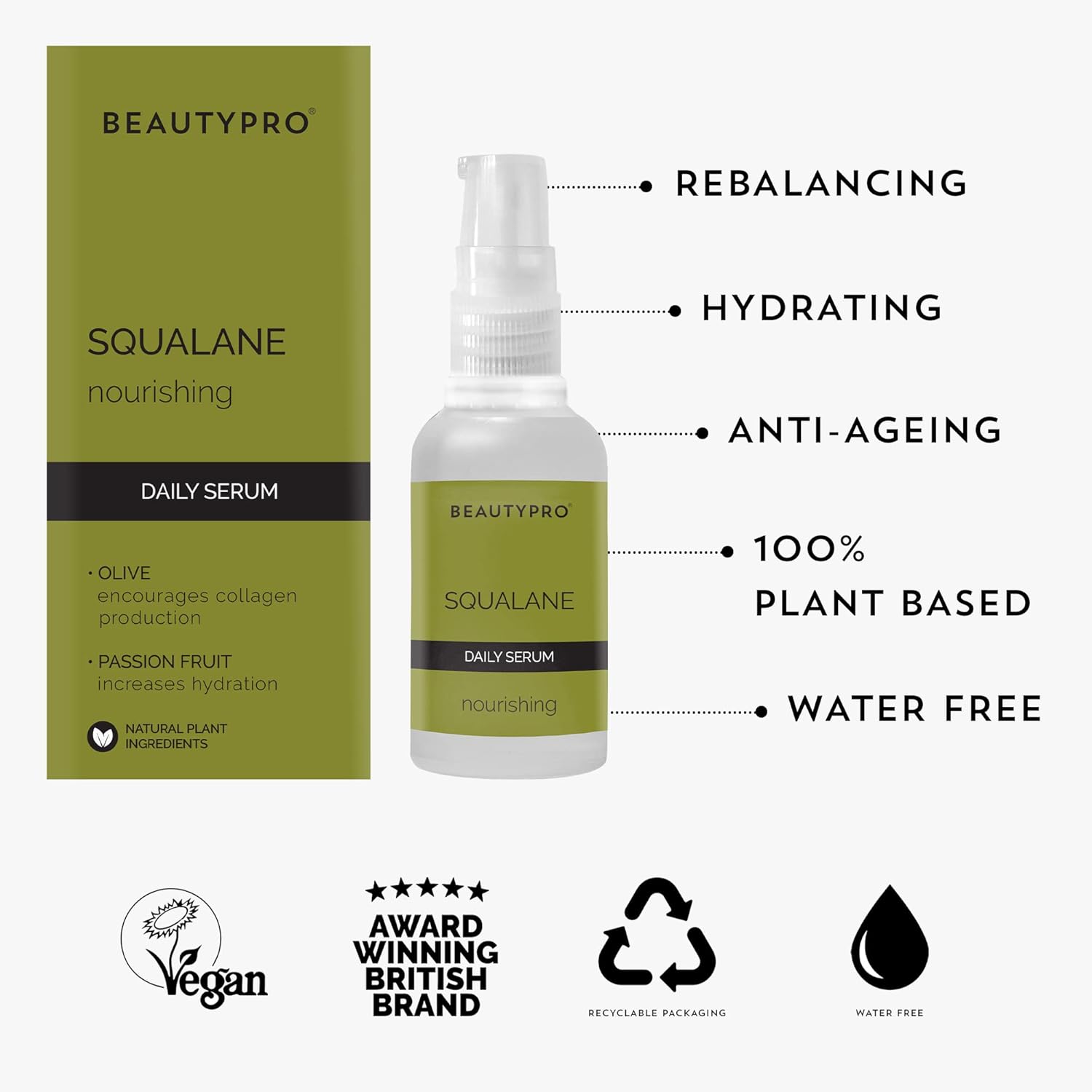 Beautypro Squalane Serum Daily Face Cream Hydrating Smoothing Energising Natural Vegan Skincare 100% Plant Based Olive Passionfruit Organic Sweet Orange Oil & Almond Oil Multi Award Winning Brand 30Ml