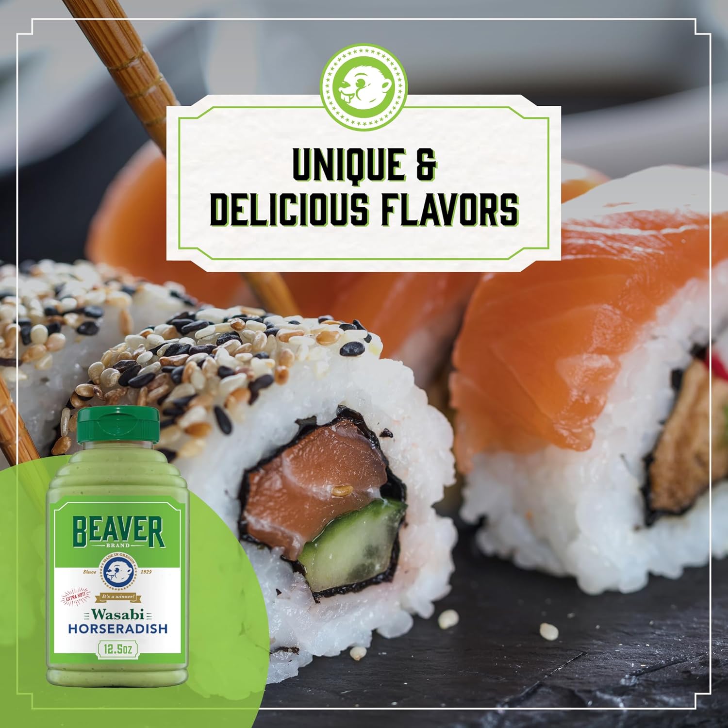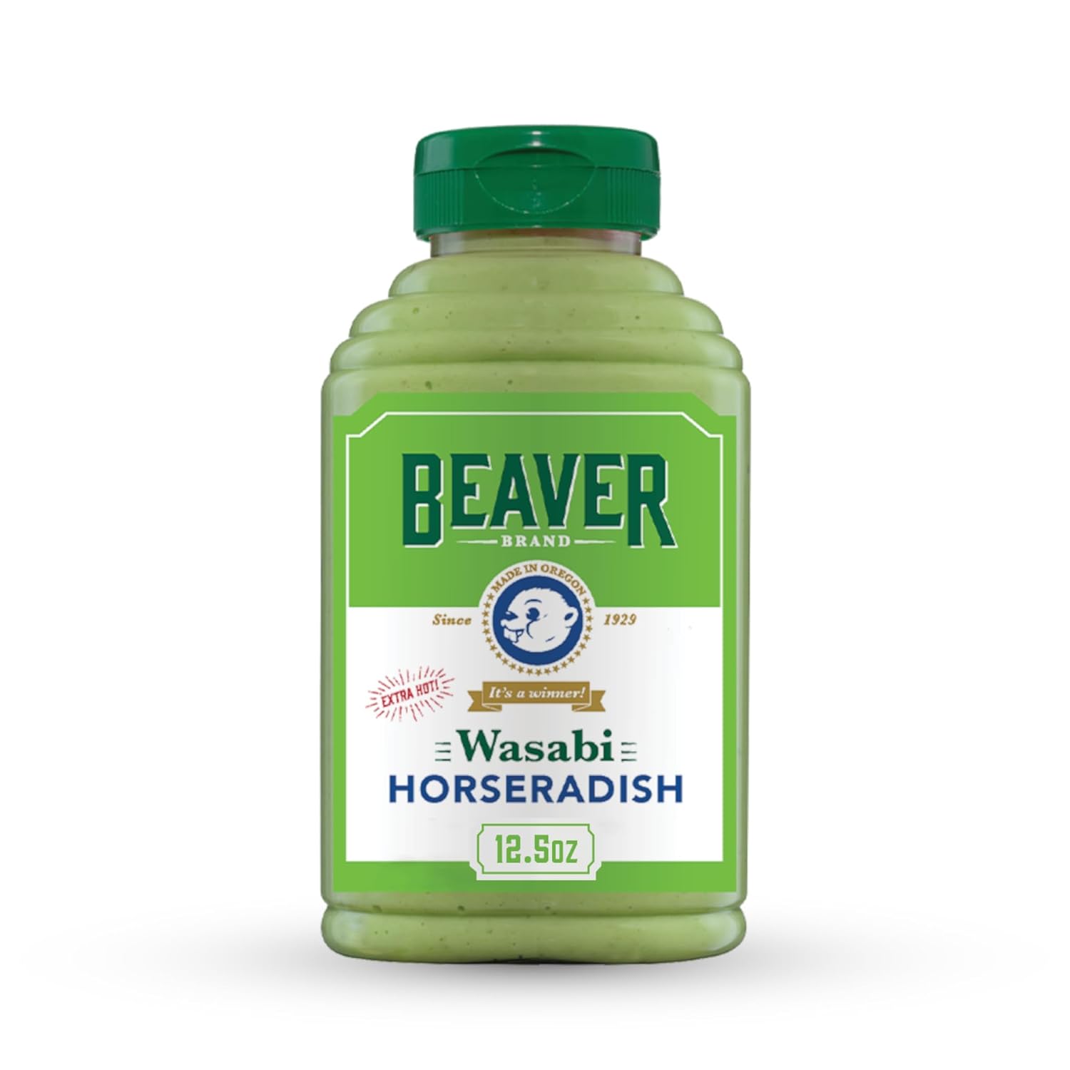 About this item Extra Hot Wasabi Horseradish: One 12.5 oz squeeze bottle of Beaver Extra Hot Wasabi Horseradish sauce Beaver Extra Hot Wasabi Horseradish sauce, made with fresh grated wasabi and horseradish root, adds spicy heat to your roast beef sandwich or prime rib Use Beaver Wasabi Horseradish sauce, as a creamy horseradish for prime rib, as a sandwich spread, or as a horseradish dip for your favorite dishes to add some heat This gluten free extra hot wasabi horeseradish sauce is suitable for a variety of diets Beaver Quality Products - for premium quality mustard, horseradish sauce, cocktail sauce and more, choose Beaver, America's finest gourmet condiments since 1929 See more product details,Extra Hot Wasabi Horseradish: One 12.5 oz squeeze bottle of Beaver Extra Hot Wasabi Horseradish sauce,Beaver Extra Hot Wasabi Horseradish sauce, made with fresh grated wasabi and horseradish root, adds spicy heat to your roast beef sandwich or prime rib,Use Beaver Wasabi Horseradish sauce, as a creamy horseradish for prime rib, as a sandwich spread, or as a horseradish dip for your favorite dishes to add some heat,This gluten free extra hot wasabi horeseradish sauce is suitable for a variety of diets,Beaver Quality Products - for premium quality mustard, horseradish sauce, cocktail sauce and more, choose Beaver, America's finest gourmet condiments since 1929