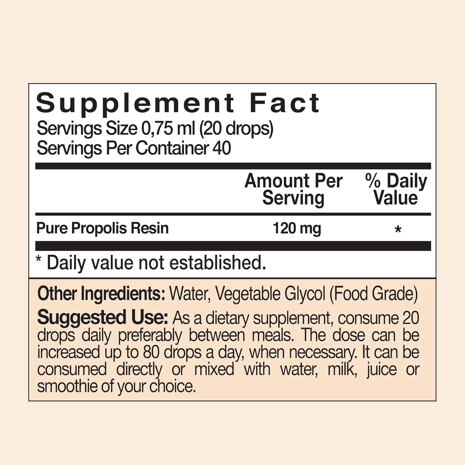 POTENT BEE PROPOLIS: Pure liquid bee propolis extract contains 150 mg of Anatolian Bee Propolis in each daily serving (10 drops, 2 times per day). It can be easily mixed with water, other beverages and food