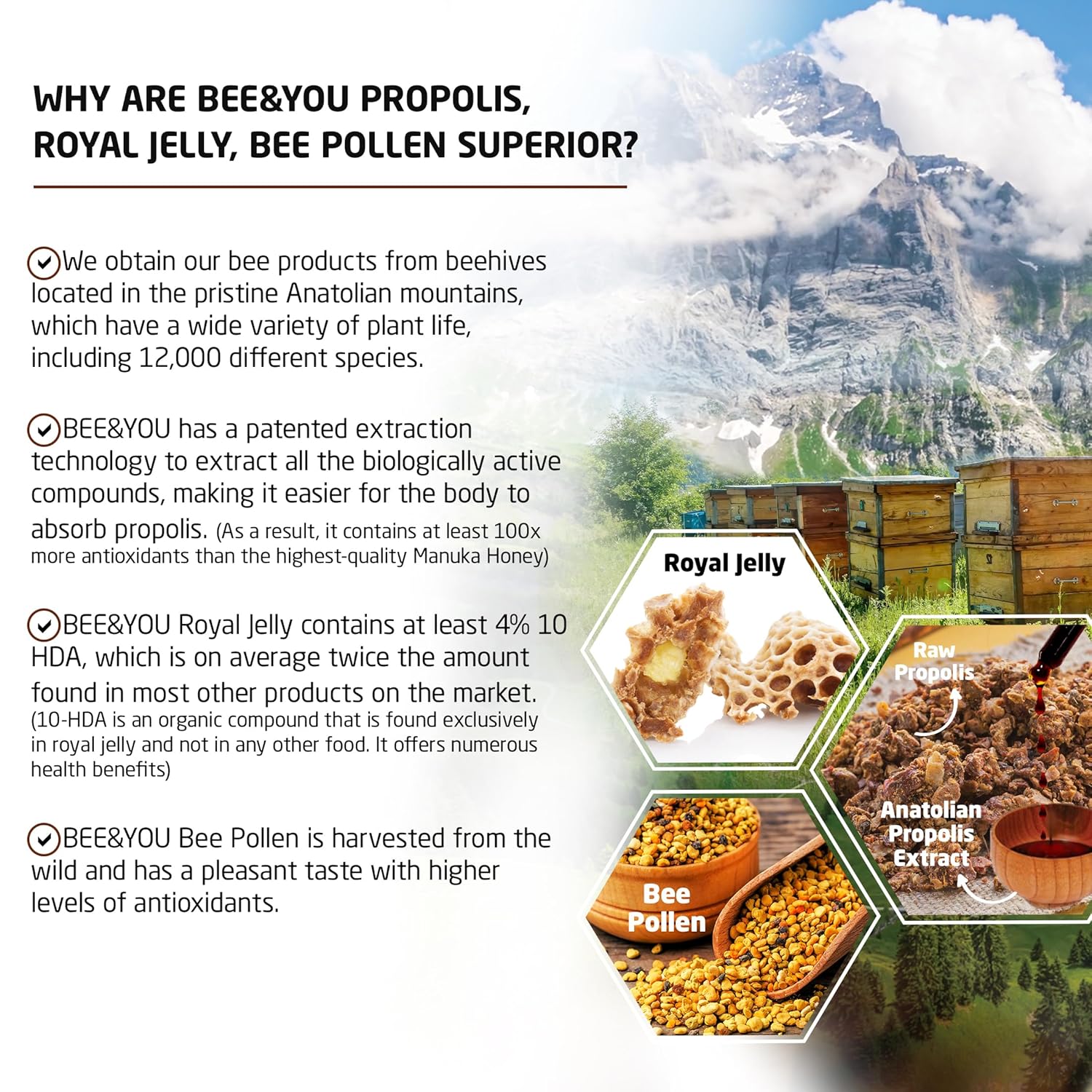 About this item This delicious and nutritious superfood is what you need every day! Highest grade royal jelly and bee propolis, sustainably harvested and mixed with raw honey to create a true bee superfood. Immunity Support: Full of antioxidants, polyphenols, flavonoids, proteins, and enzymes to support your health and wellness. Promotes healthy energy levels. Energy & Vitality: Keeps your energy and vitality up all day long with its high royal jelly content. Take minimum 2 teaspoons or more in the morning to support your healthy energy levels. Cognitive Health Support: 10-Hda and Royalactin are two unique compounds found only in Royal Jelly, proven to improves cognitive functions and fights brain fog. Our propolis has 3 times more antioxidants than the highest-grade Manuka Honey. Our product is 100% Natural, Gmp, Brc, Iso 22000, Iso 9001 and Ifs Certified. Contains No: artificial preservatives, colors, refined sugar, gluten, wheat, yeast, corn, soy, dairy, egg. Made in Türkiye. Made in Türkiye. KTUN:8683813000270 › See more product details,This delicious and nutritious superfood is what you need every day! Highest grade royal jelly and bee propolis, sustainably harvested and mixed with raw honey to create a true bee superfood,Immunity Support: Full of antioxidants, polyphenols, flavonoids, proteins, and enzymes to support your health and wellness. Promotes healthy energy levels,Energy & Vitality: Keeps your energy and vitality up all day long with its high royal jelly content. Take minimum 2 teaspoons or more in the morning to support your healthy energy levels,Cognitive Health Support: 10-Hda and Royalactin are two unique compounds found only in Royal Jelly, proven to improves cognitive functions and fights brain fog,Our propolis has 3 times more antioxidants than the highest-grade Manuka Honey. Our product is 100% Natural, Gmp, Brc, Iso 22000, Iso 9001 and Ifs Certified. Contains No: artificial preservatives, colors, refined sugar, gluten, wheat, yeast, corn, soy, dairy, egg. Made in Türkiye,Made in Türkiye. KTUN:8683813000270