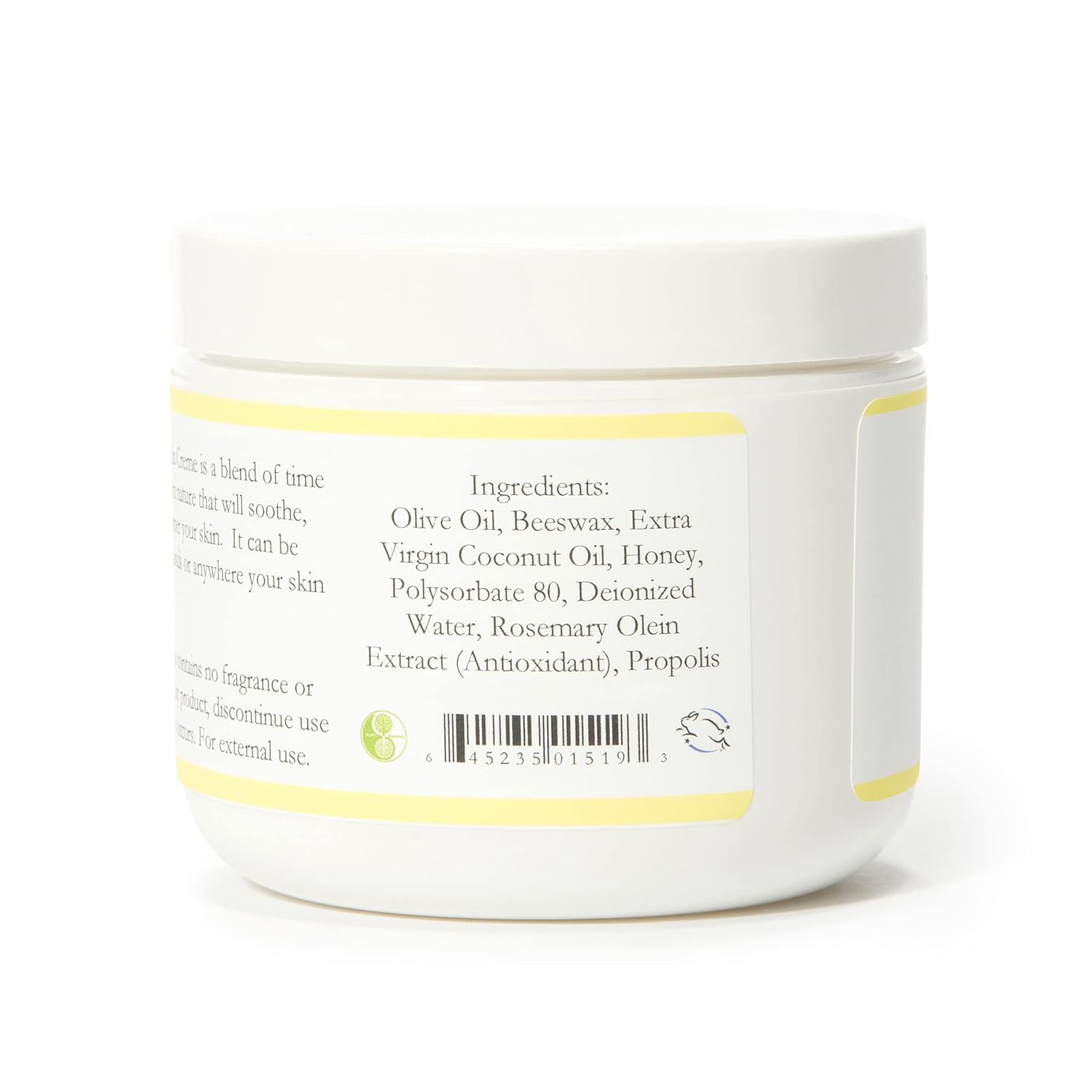 All Natural Skin Creme - Pure Nourishment For Your SkinContains No Harsh Chemicals or PreservativesOur Creme is a Blend of Time Honored Ingredients From Nature That Will Soothe, Soften, Nourish and Pamper Your SkinIt can be used for the face, lips, hands.....anywhere your skin needs a little tender loving careMade With All Natural Ingredients - Olive oil (olea europaea), beeswax (cera alba), virgin coconut oil (cocos nucifera), honey, propolis and rosemary (rosemarinas officinalis)