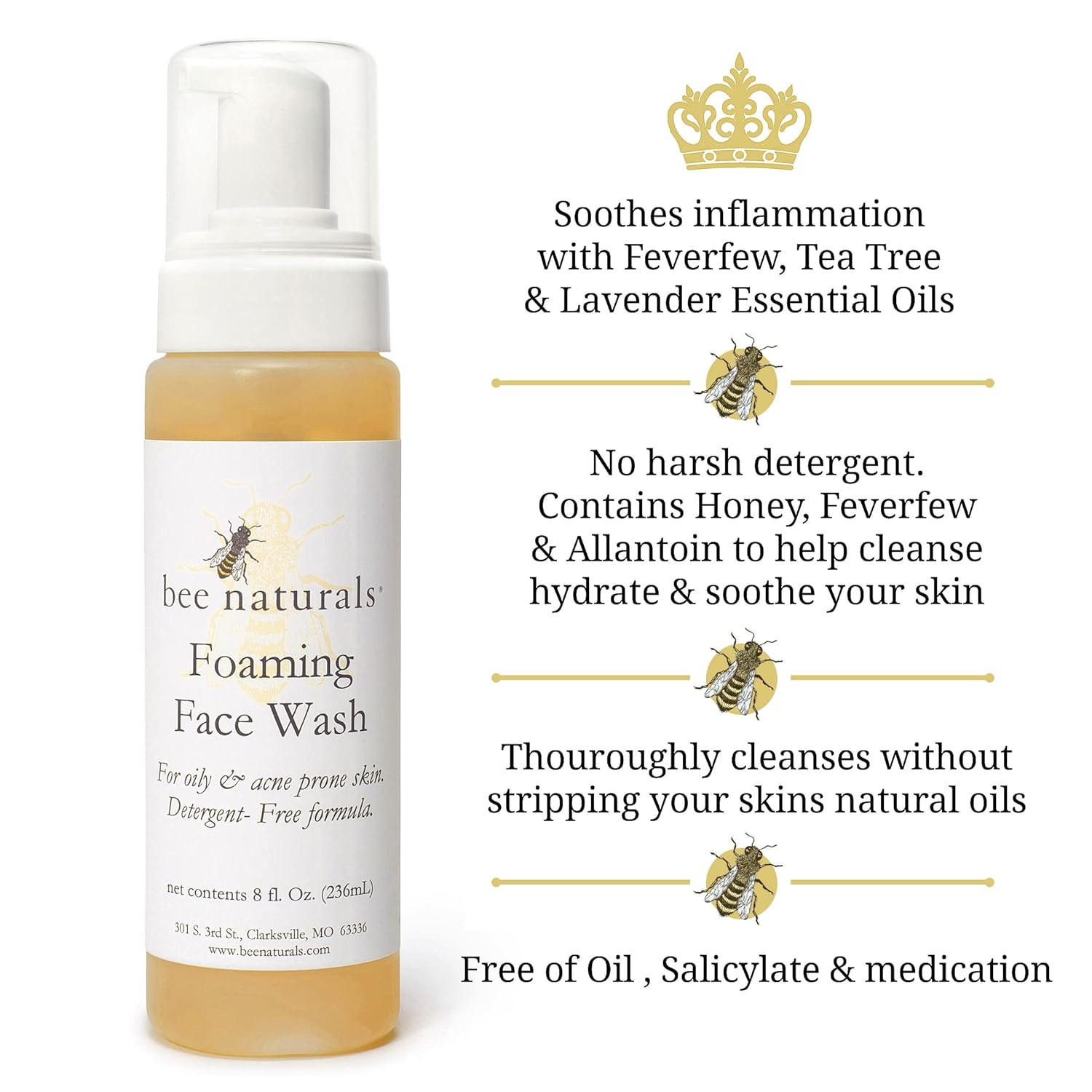Bee Naturals Self Foaming Face Wash - Light, Foamy Cleanser for Oily & Troubled Skin - Soothes Inflammation - Rose, Grapefruit, Tea Tree and Lavender Essential Oils Plus Feverfew Extract - 8floz