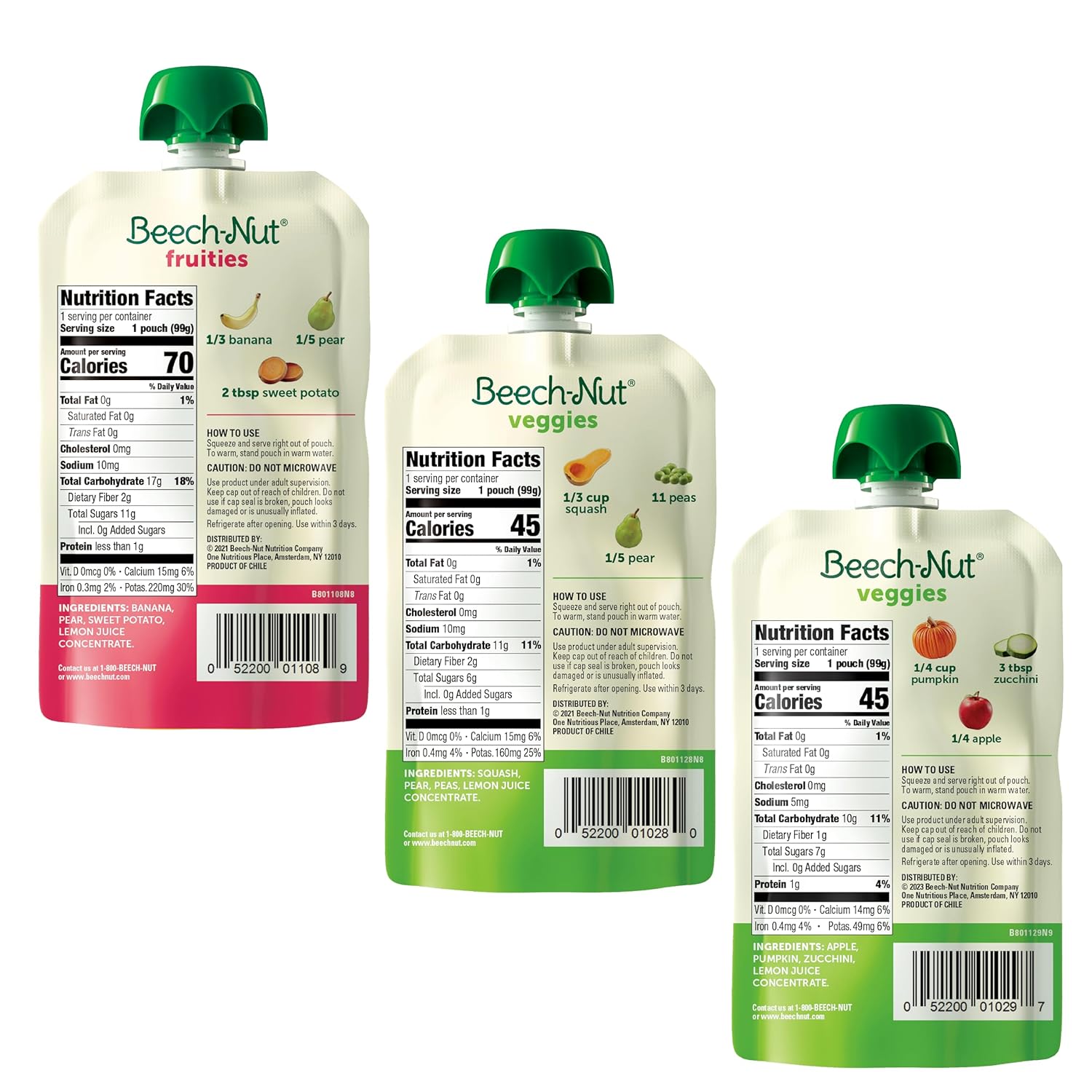 Beech-Nut Baby And Toddler Food Pouches Are Made With Real Ingredients And Packed In Convenient Pouches For On-The-Go Feeding. This Beech-Nut Farmer'S Favorites Variety Pack Contains (6) Banana, Pear, Sweet Potato, (6) Squash, Peas, Pears, And (6) Pumpkin, Zucchini, Apple Baby Food Pouches. Our Blends Contain Real Fruits And Veggies. Beech-Nut Baby Food Pouches Are A Delicious Way To Squeeze More Fruits And Vegetables Into Your Little One'S Day. This Stage 2 Puree Is Ideal For Your Baby 6 Months And Up
