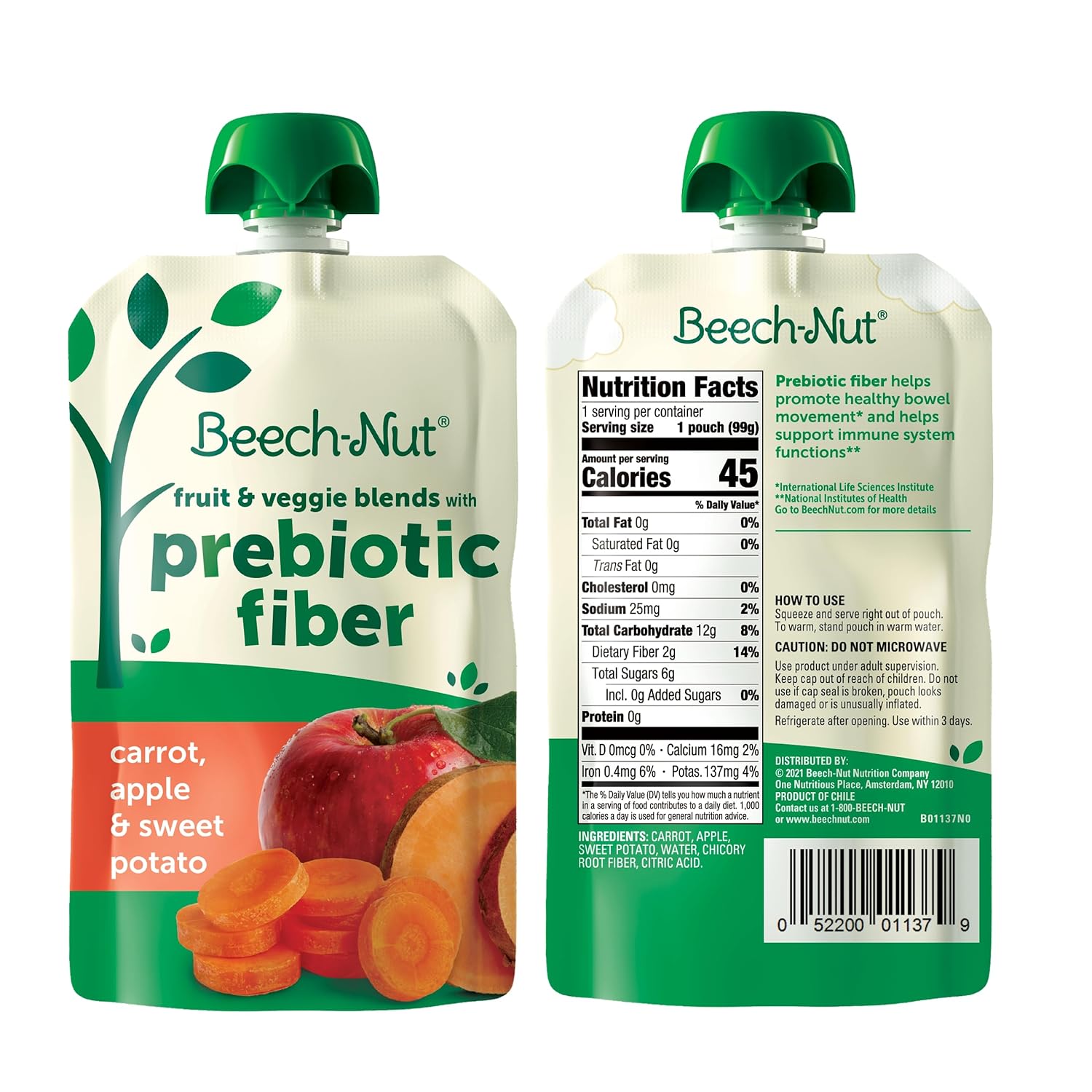 Beech-Nut Baby & Toddler Food Pouches With Prebiotic Fiber, Carrot Apple & Sweet Potato, 3.5 Oz (18 Pack)
