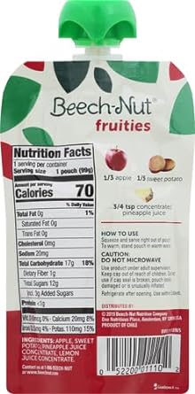 Beech-Nut Baby and Toddler Food Pouches are made with real ingredients and packed in convenient pouches for on-the-go feeding. Our fruities blend contains apple, sweet potato and pineapple gently cooked with indirect heat to preserve flavor and nutrients. Our baby food pouches are a delicious way to squeeze more fruits and veggies into your little one's day. This Stage 2 puree is ideal for your baby 6 months and upDelicious blend of apple, sweet potato & pineappleNo artificial preservatives, colors or flavors and no added sweetenersNon-GMO (made with ingredients that are not genetically modified)Stage 2 for babies 6 months and up