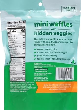 Beech-Nut Mini Waffles With Hidden Veggies Are A Delicious Toddler Snack With Real Fruits And Veggies Like Pumpkin And Apple. With 3G Of Sugar Per Serving And Veggies In Every Bite, They'Re A Great Alternative To Other Sugary Treats. With A Mini Size That'S Great For Self-Feeding, Our Toasted Biscuits Are The Perfect Snack For Toddlers At Home Or On The Go. Each Bag Contains 18 Mini Waffle Crisps. As A Stage 4 Snack, Mini Waffles Are Ideal For Children 12+ Months. This Product Should Only Be Fed To Seated, Supervised Children Who Are Accustomed To Chewing Solid Foods